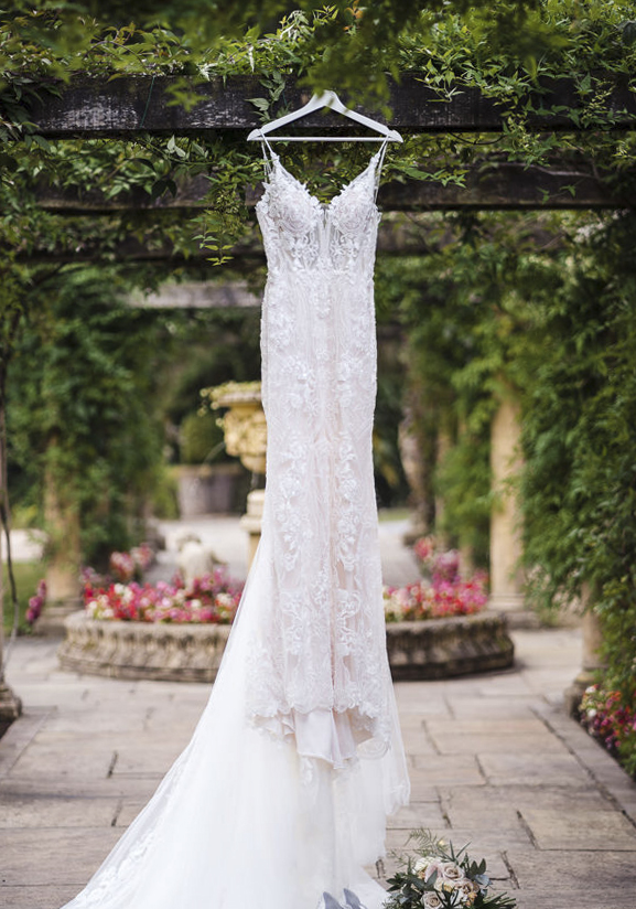 "I knew that my wedding dress would be an Enzoani wedding dress from the minute I got engaged! I just had to find the right one for me. I screenshotted Paisley from the Enzoani website on 5th Dec 2020 and sent it to my sister – I knew straight away I had to try her on! The White Boutique in Leamington Spa put beautiful Paisley on their Instagram story just 7 days later …12th Dec 2020. Meant to be?!?! Having had my original booking cancelled due to the lockdown, I contacted them straight away to rearrange an appointment. She was the first dress I tried on, and I knew instantly Paisley was the one. The beading, the subtle sparkles, the gorgeous lace, the low back, the train, the fit, the drama… I felt incredible!"