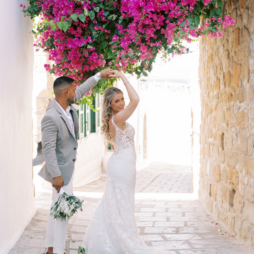 After many appointments in wedding dress shops, I came across the Nefertiti dress and knew it was the one! I loved the sparkle layer under the dress, which shimmered in the sun, the beautiful flower pattern and the different colours the dress came in, which suited my skin tone (I went for ivory-nude-nude which meant there were skin-coloured panels which broke up the dress and made it look quite natural). I changed the straps and added additional flower appliques to make it personal to me. The dress paired with the veil was perfect and made me feel really special on such an unforgettable day."