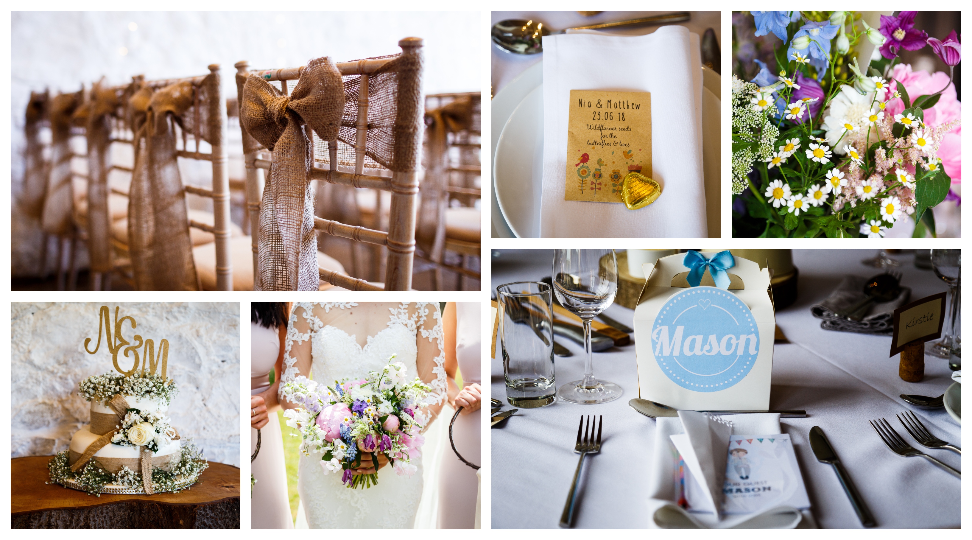 Every decorative detail seems perfectly in tune with Nia’s wedding day theme of 'Wildflower Romance,' from the rustic style bows and bunting, to the delicate gypsophila flowers wrapped around the wedding cake and cute packets of wildflower seeds gifted to their guests.It’s clear that it’s the small details which mean the most to Nia...