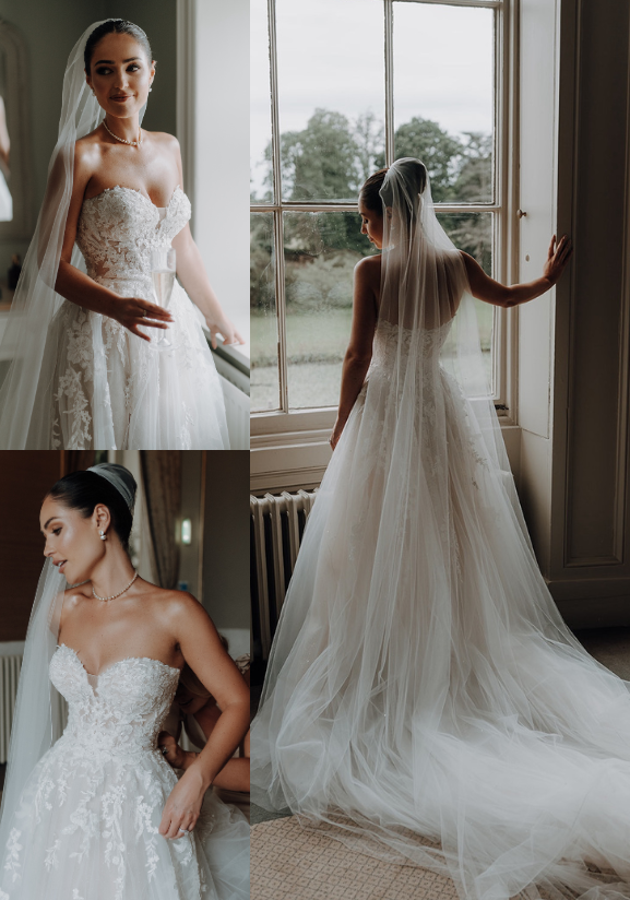 "The Natsuko dress by Enzoani was the 5th dress I tried on, and I instantly fell in love! There were a few dress components that I wanted to incorporate; I have always loved the idea of something very romantic and feminine that I could almost float down the aisle in, and this dress gave me all of that! The fine lacy embroidery that covered the bust, the delicate button-down detail at the back that gave way to a light, floaty, full tulle bottom half scattered with fine flowers was perfection. I also loved the fact that it had a hidden split up the front which gave it a modern, sexy edge. I definitely got my princess moment in this dress!"