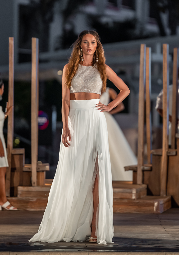 This playful two-piece gown glistened and glided down the runway with her lovely beaded, cropped bodice. Its lightweight chiffon skirt gave an effortless look and soft touch that stole breaths during the show.