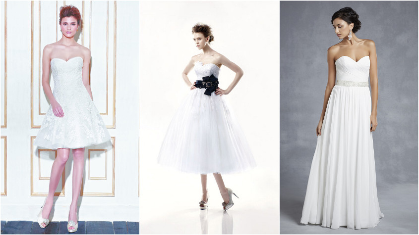 For our brides who want jaw-dropping glamour walking down the aisle, but a no-muss, no-fuss dress for the reception, we've got the solution: one gown with a showstopping cathedral train for the ceremony, and one equally gorgeous (but shorter) version for after! Karolina (above left), Kassandra (above middle), and Khloe (above right) from the 2016 Enzoani collection are signature stunners with extensive lace trains to gracefully trail wherever you go, while Galveston (below left) and Danbury (below middle) will give you extra room to shimmy and shake on the dance floor - and stay cool at the same time! But if you're looking to stick with a floor-length option for the reception, take a cue from our favorite duchess Kate Middleton and choose BT15-24 (below right), a classic belted A-line gown that puts the 'sweet' in sweetheart neckline.