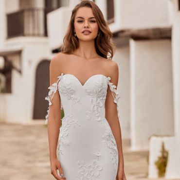 TEE is the ultimate double-take dress. She’s all glam, all drama with a luxurious, detachable overskirt. Designed for the bride who wants two unforgettable looks in one.