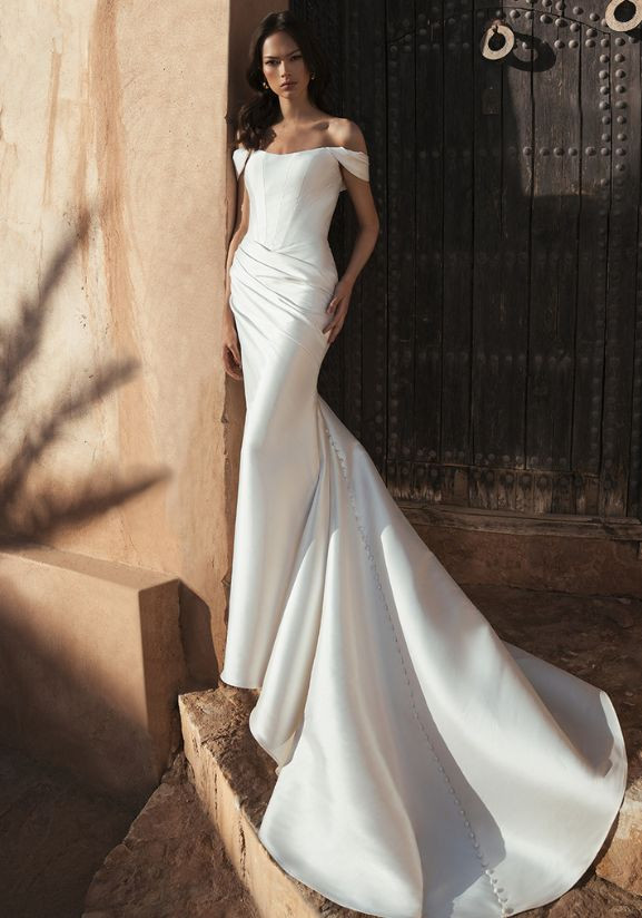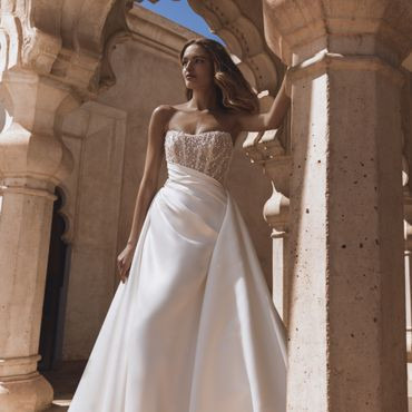 • Seeks a bridal gown that combines modern tailoring with romantic details