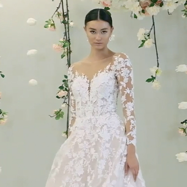 "And next up, we have the gorgeous MAXIMILIENNE. And now this dress already has such a unique flair to it. You’ve got embroidered lace, you’ve got Chantilly lace, you’ve got organza, you’ve got Mikado, tulle, you’ve got layers. There’s just a lot of texture to this dress. Obviously not every bride is looking for strapless, so let’s see what we can add to it to change up the look. Another thing with adding something to a strapless -- I love the idea that it can be removable and that it doesn’t have to just be on the dress at all times. You can wear something for the ceremony then switch it up for the reception, so there’s just a duality with that that’s really fun. This dress on its own is such a great stand-alone. It’s dramatic, it’s got a very classic traditional vibe to it, but there is just an element of it being modern and updated, so let’s just see what adding a little something extra to it can do to the overall look of the dress."