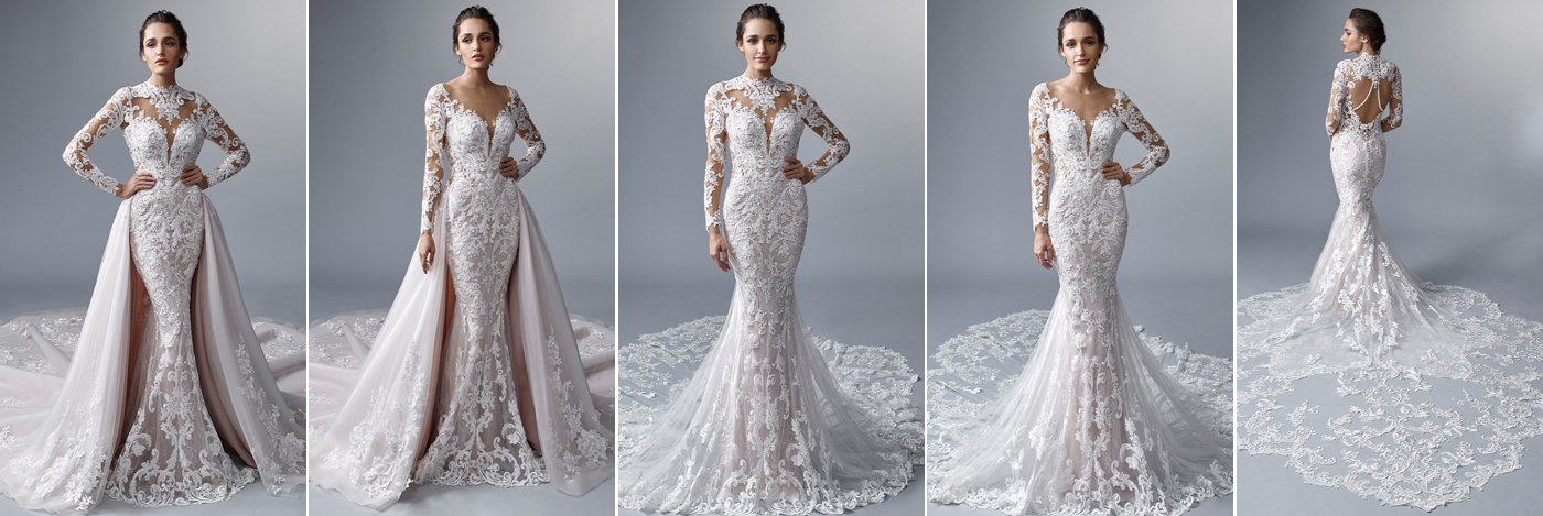 "Okay, come on, if you are a bride vibing on this open skirt/overskirt/open-front look, that is definitely trending right now. It’s so beautiful, it’s so classic, it’s so sophisticated. Wow, this dress paired with this open front skirt is just... It leaves nothing to be desired. Truly. There’s so much drama. There is such an element of sophistication and class. And, ÉLYSÉE is based off of a lot of French inspiration, and this dress just completely embodies that to me. I love the couture element of the open-front skirt. It is layers upon layers upon layers of a -- not just tulle -- but a nice sturdy fabric that really just has this very ethereal element to it, and the lace placement on the skirt itself is incredible. This is just a great way to achieve that A-line look, if you want something a little bit fuller for your ceremony and then want to be able to take it off for the reception, do something a little bit lighter. Wow, what a way to really jazz up your whole look for one portion of the evening and then be able to take it off! I love that. I love being able to have that transitional look where you can switch it up. Wow, this skirt, this open-front skirt paired with KOH-I-NOOR is A+, incredible. We still have another trick up our sleeve though."