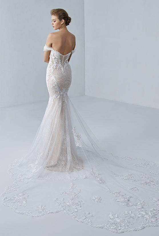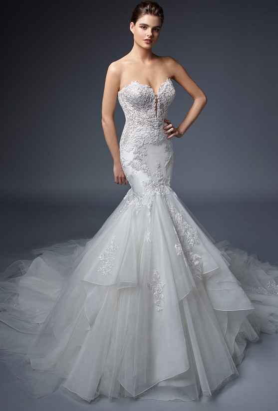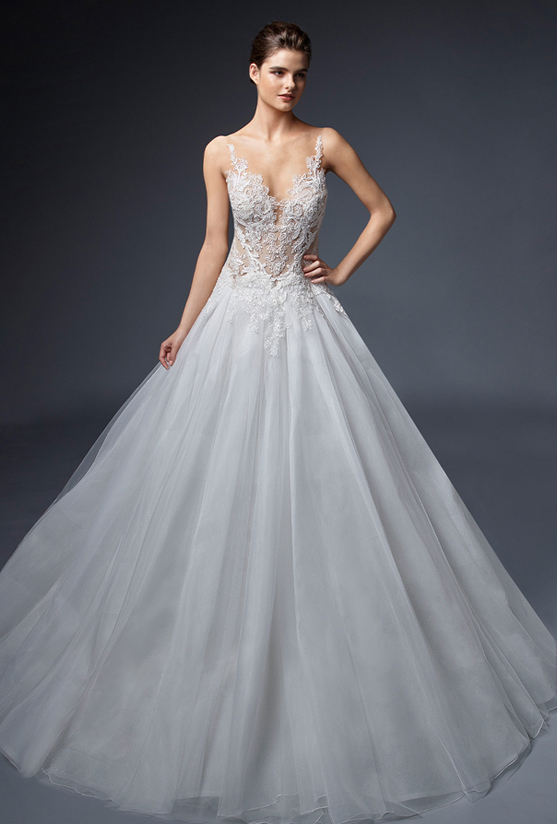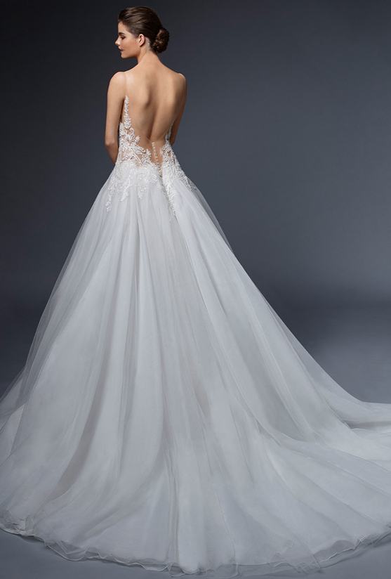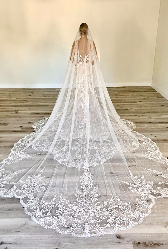 "Okay, and now we have FLEUR. And she is just a gorgeous little romantic beauty. She’s traditional, but I love how the skirt just has those bigger appliques onto the tulle, just kind of spaced out. The top is a little more condensed. She is just very romantic. She is very beautiful. So we are going to add a veil to this beauty and see how we can kind of change up the look, the whole vibe... Let’s see what we got."