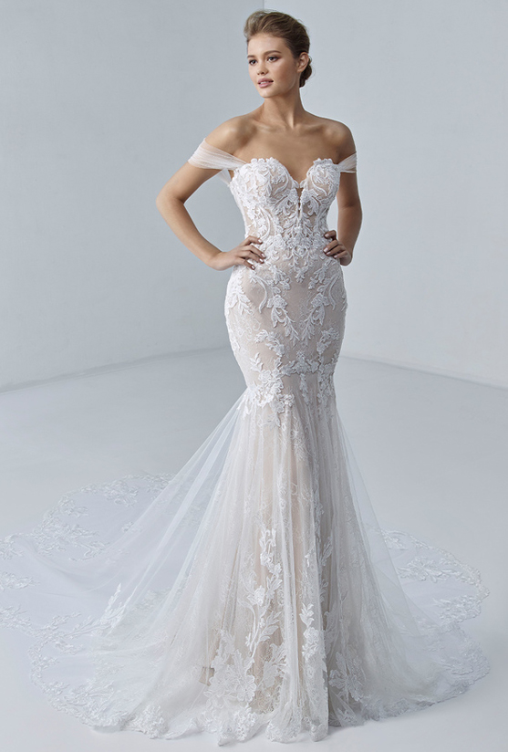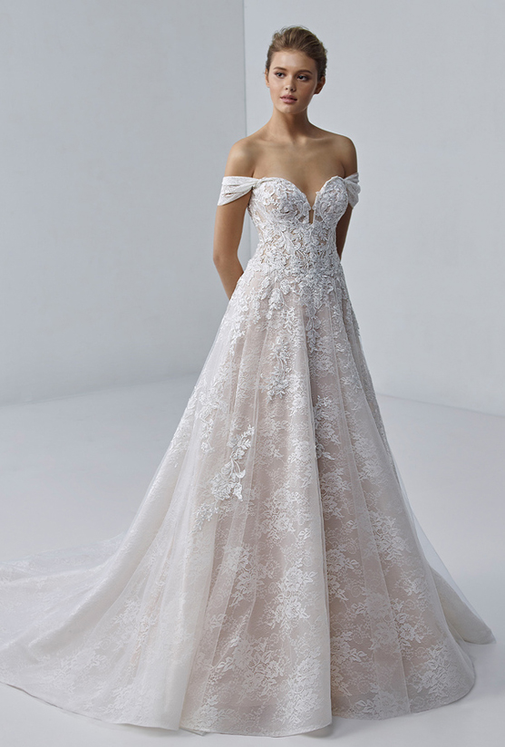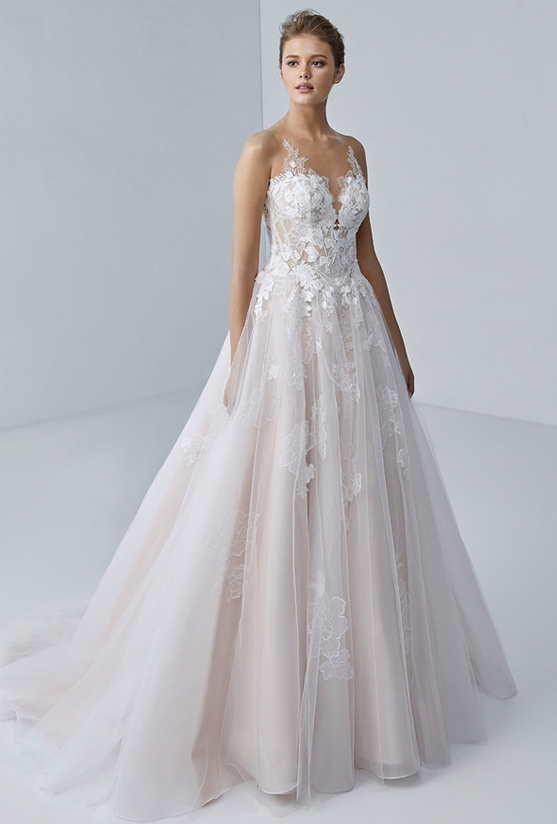 "Moving onto ÉTOILE, we have the gorgeous ESMÉE. And this dress is just a dainty, romantic little beauty. Am I right? I’m right. I mean, the sparkly floral lace, the tulle skirt, the scalloped neckline. This dress has just got such an ethereal, soft, romantic look to it. It’s very traditional in its own way, so we are going to add the accessory to this. We are going to rock this dress’s world, we are going to see what we can do to change it up."