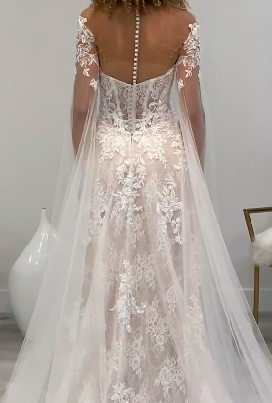 "Okay, so this is ESMÉE with the HIPPOLYTA SLEEVES, and it’s giving me life. This is everything that I could have ever... I mean, I’m biased. This is completely my style. I am so in love with how the front of these sleeves add the off-the-shoulder lace detail that looks like it’s just kind of floating, and then we have these incredibly long tulle sleeves that are just flowy and bohemian and so romantic. This is such a great way to add a little bit of extra something and flair in lieu of maybe doing a veil. This would be something you could sub out for a veil. I absolutely love the dreaminess of this look, this could be very bohemian. I venture to say this is pretty much a bohemian look. But, there is just such an ethereal, soft, romantic, dreamy element to these sleeves. I am in love. They have those open slips in the front so you have full mobility. It just really ups the ante, changes it up without making it ridiculous. It still looks super romantic, super soft. This complements this dress perfectly. HIPPOLYTA SLEEVES for president 2020. In love. I’m done. Drops mic. Okay but not really, there’s more dresses."
