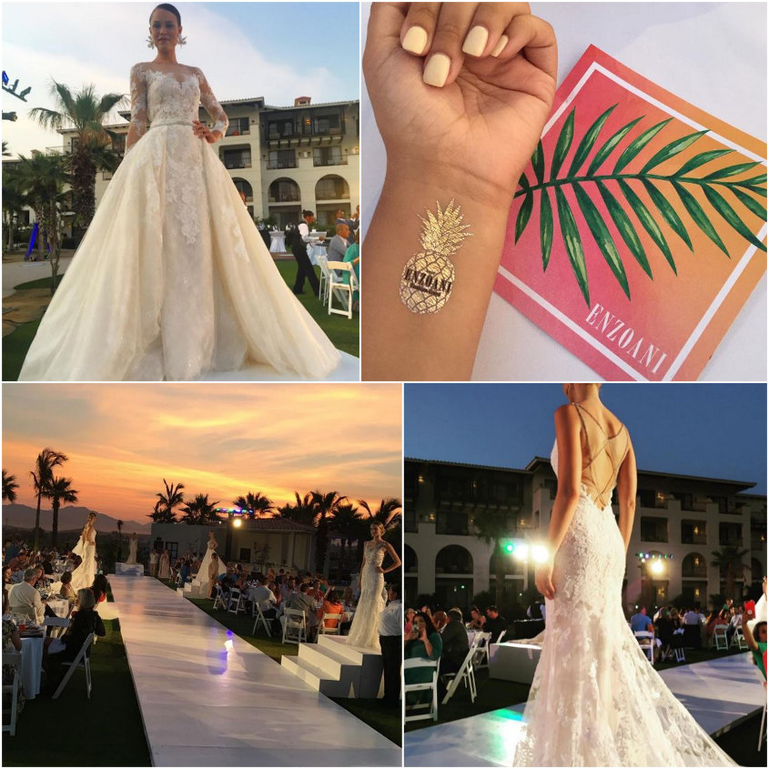 Pictured above (clockwise, starting top left): MALLORY - photo by Panache Costa Mesa; #EnzoaniTakesCabo tattoo! - photo by Erika's Bridal; KYMMY - photo by Simply Elegant Bridal; #EnzoaniTakesCabo runway at sunset - photo by Blush Bridal Couture