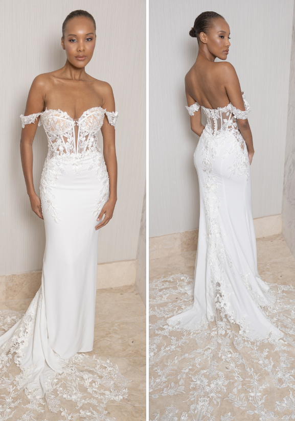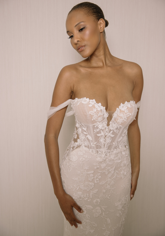 Sexy and spectacular, this off-the-shoulder mermaid gown will have all eyes glued on you. This curve-hugging dress glistens with her beaded floral embroidered motifs that cover the corset-style bodice with illusion side cut-outs. This alluring and exquisite look is completed with our signature Enzoani scalloped lace cut train.