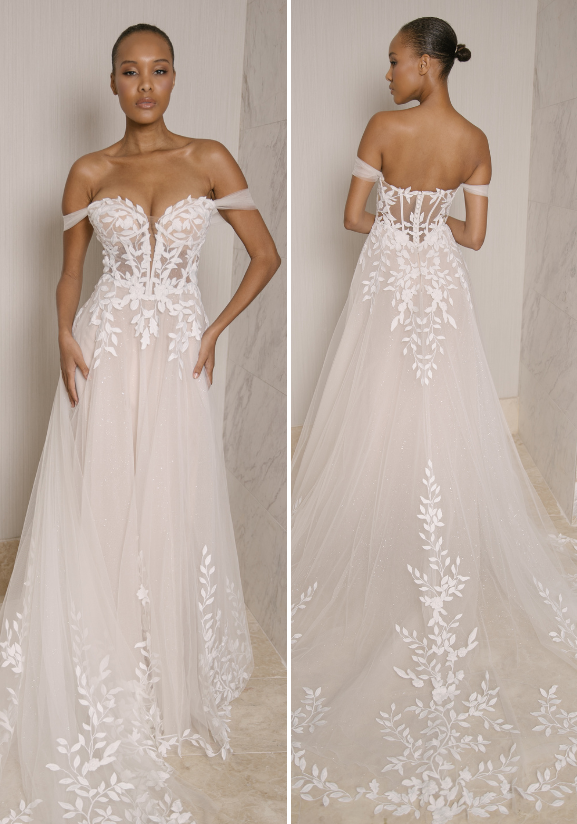 We are absolutely enchanted with this sweet and sophisticated A-line bridal gown featuring custom, 3D embroidered vine lace that flows from the bodice onto her lovely skirt. A stunning, sparkly layer and soft tulle straps will leave your wedding guests utterly captivated.