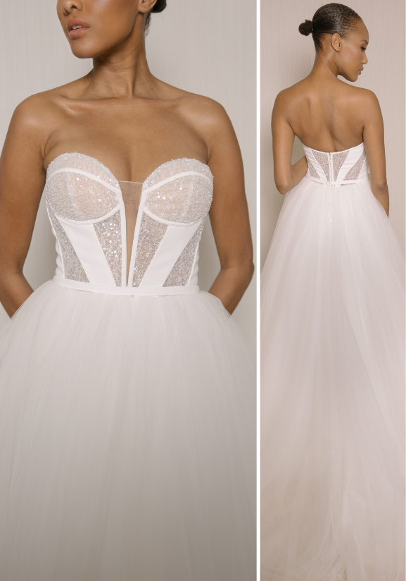 If a gown could emulate soft glamour, it would be PENINA. This irresistible ball gown features a shimmery beaded bodice with exposed boning details and a whimsical tulle skirt for a flirty, youthful flair. This dreamy wedding dress is truly made for all our modern fairytale brides!