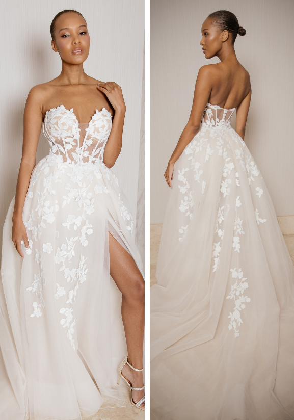 If you're looking for a sweet but sexy princess bridal look, this soft ball gown is made for you. This ever-so romantic gown features bespoke 3D floral lace that cascades into an airy, dreamy skirt. She also has a corset-style bodice and skirt slit for a glamorous, modern touch to the dress.