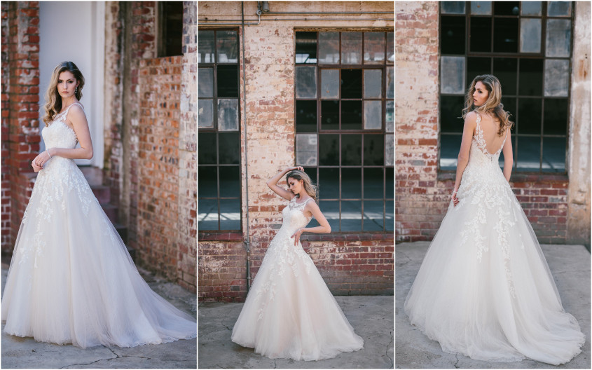 The classic A-line gown will never go out of fashion. Style BT18-12 (pictured above and below) features intricate lace appliques, a tulle skirt, and a stunning lace-trimmed V-back.