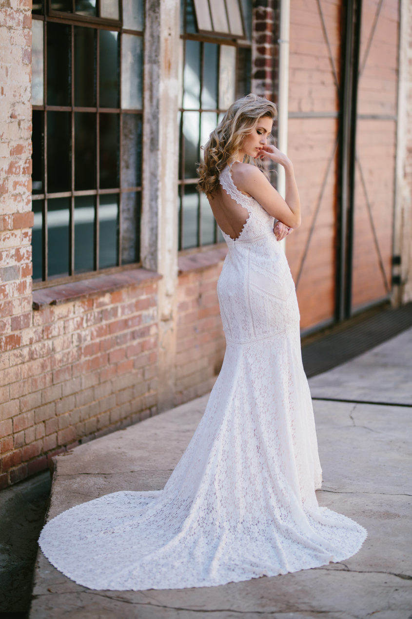 It’s all about the lace with style BT18-29 (pictured above and below): this vintage inspired dress features a halter illusion neckline, key-hole back and an elongated train.