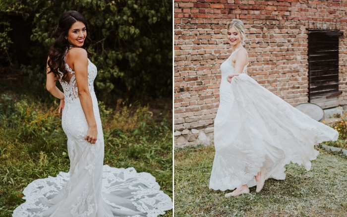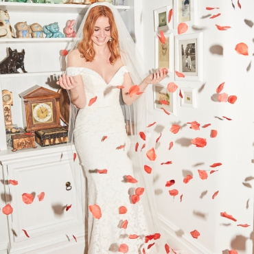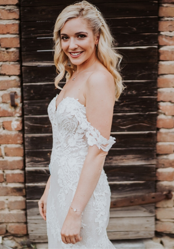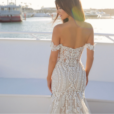 The soft floral lace of the Mareena gown is layered to give a beautiful 3D effect. Its detachable off-shoulder straps and sweetheart neckline give this gown an ultra-feminine feel.