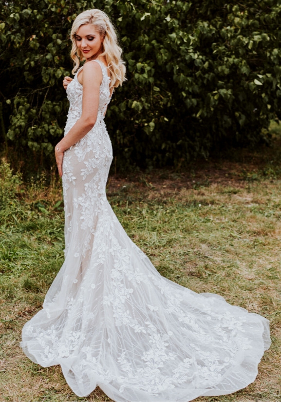 You'll be sure to take centre stage in this gorgeous mermaid gown. The 3D floral motifs and exquisite low V-back are simply divine!