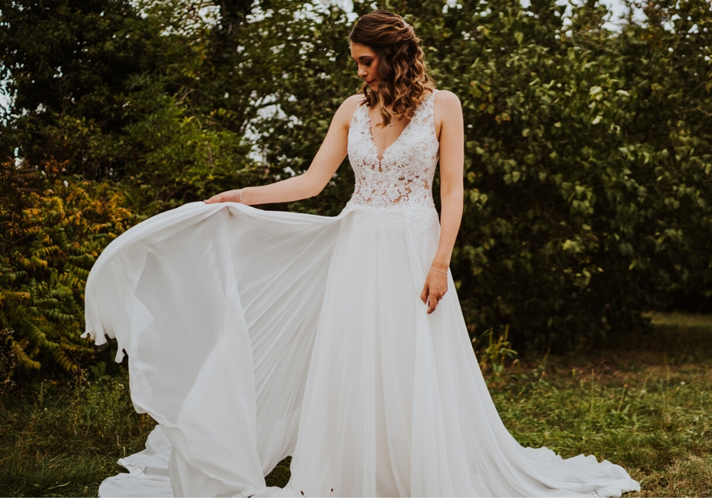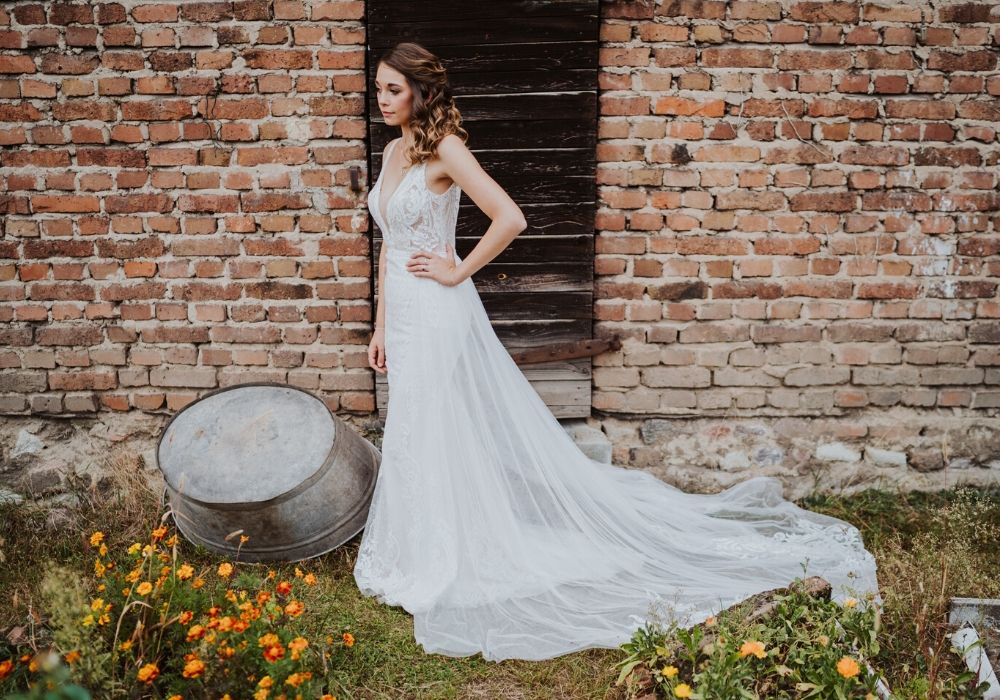 The MAI gown is romantic and also super versatile! Wear this gorgeous gown with or without its detachable, sequined tulle train for an effortless day-to-night bridal look.