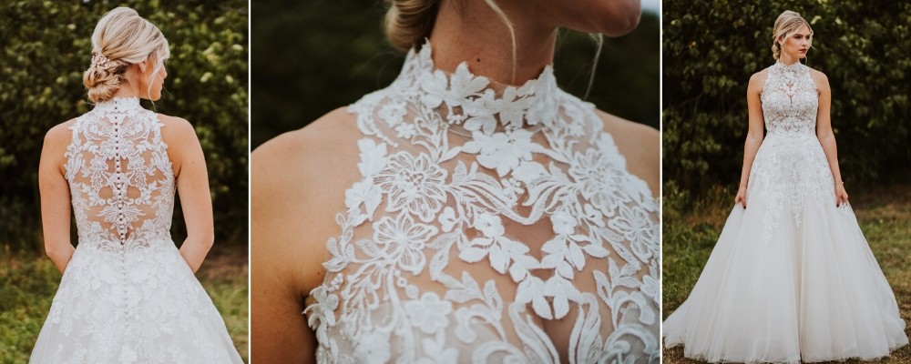 The detailing on the MARCI gown's illusion bodice is sweet and playful and the regal lace adds a vintage touch to this beautiful style.