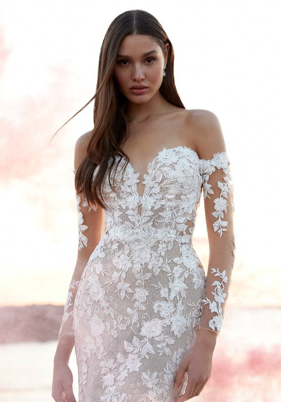 This off-the-shoulder, long sleeved wedding dress style is brimming with contemporary romance and elegance. This all-over lace look is delicate with a hint of sexy. The sequin floral embroidered lace and Chantilly lace pool into a stunning train to add an extra wow factor. The boning in the bodice provides that perfect support and structure. Tap the link below for a close-up of the most showstopping sheer back detailing.