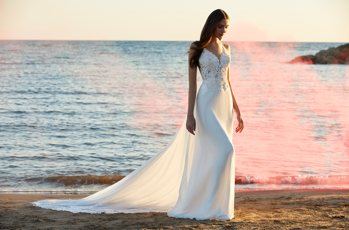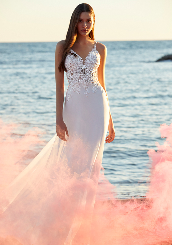 Last, but certainly not least -- NOVELLA is the sweet, free-spirited "enchantress" wedding dress you've been dreaming of. Imagine your spring/summer wedding with a slight breeze blowing at your light chiffon skirt. Delicate details including the sequin floral embroidered and Chantilly lace. The beaded straps and back neckline give a touch of glimmer. Start a whole new love story with this beauty.