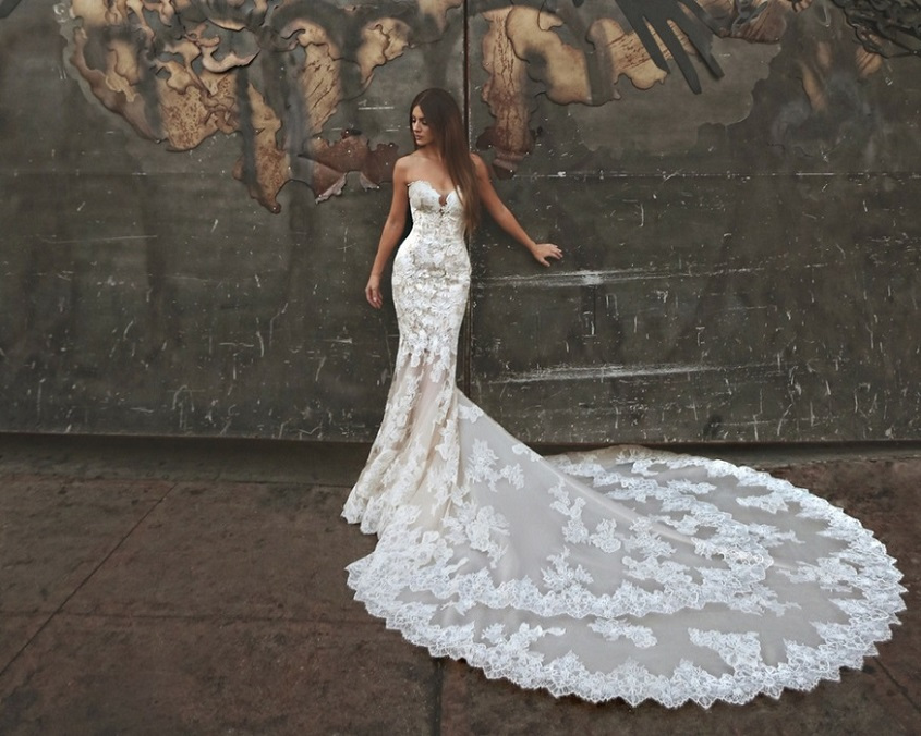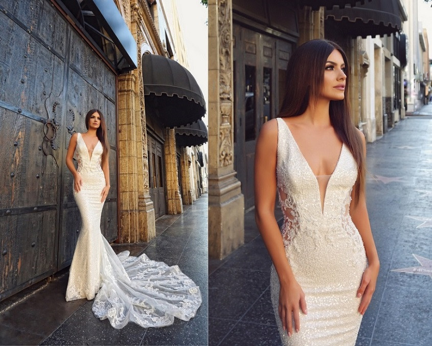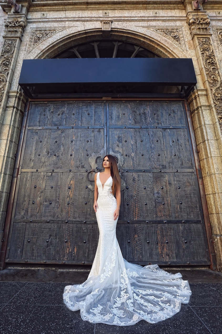 Mercedes' deep sweetheart neckline adds to its alluring merrmaid silhouette. Intricate beadwork from its bodice are complemented by its lace train.