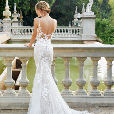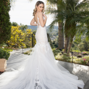For the brides who relish the spotlight and crave a completely glam, unique look for the big day, this mermaid style features detachable, shoulder-baring lace sleeves with a playful blouson effect that tapers down into a fitted long sleeve. With or without the sleeves, the gown is gorgeous with floral embroidered lace swirling throughout the bodice and sprinkling onto the illusion corset-style back. This ultra-romantic look is complete with the dreamiest organza and tulle train with lace detailing.