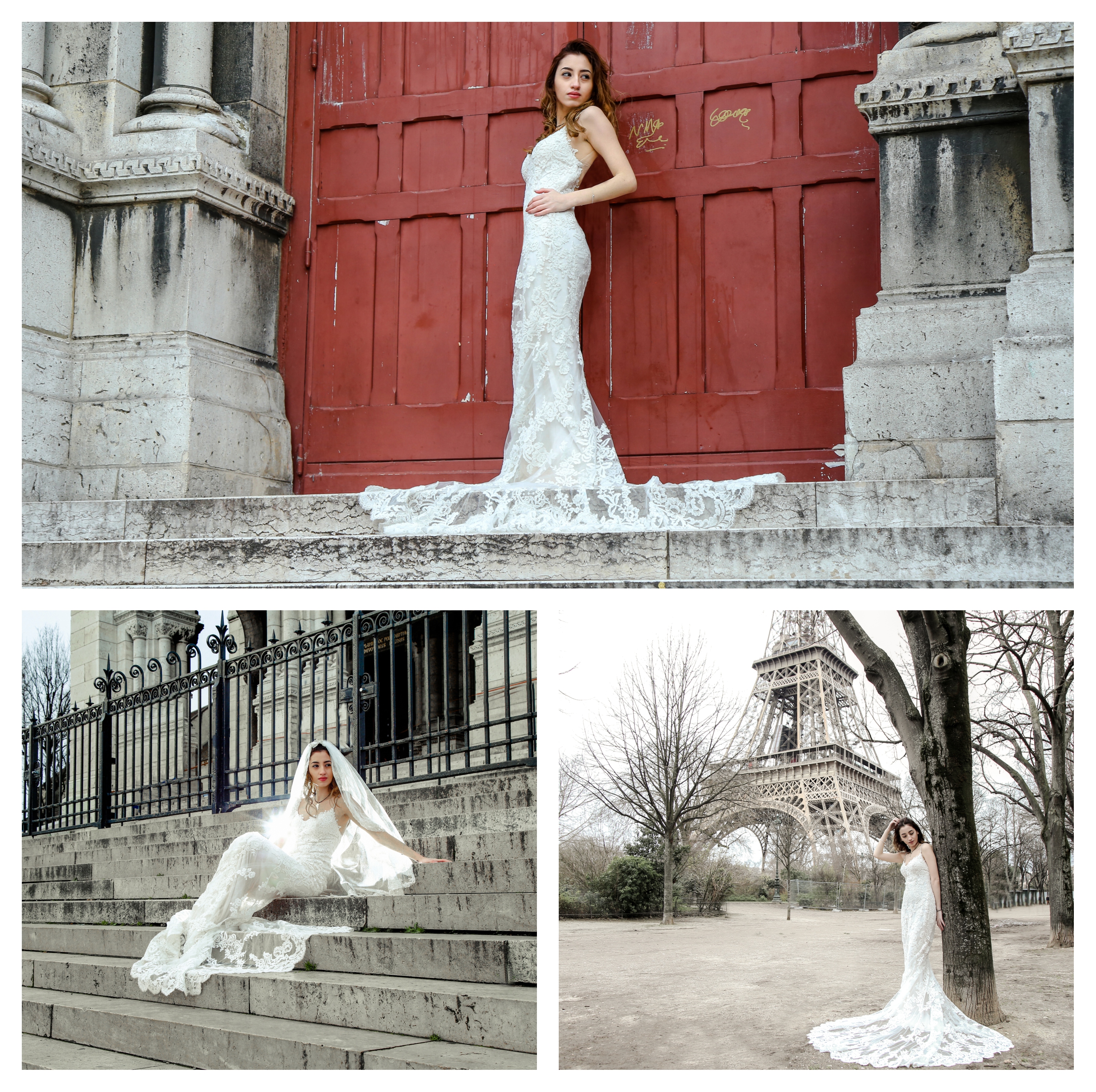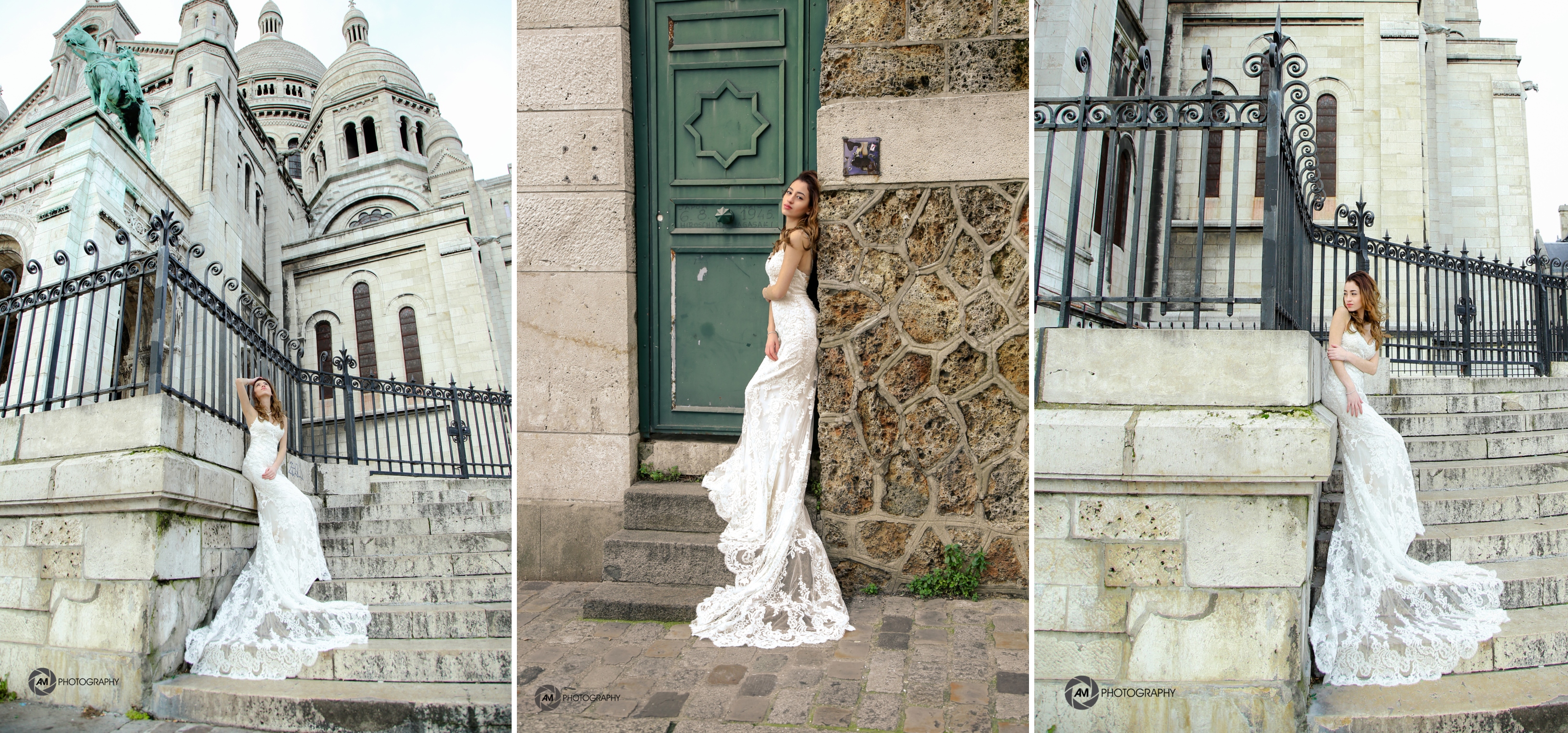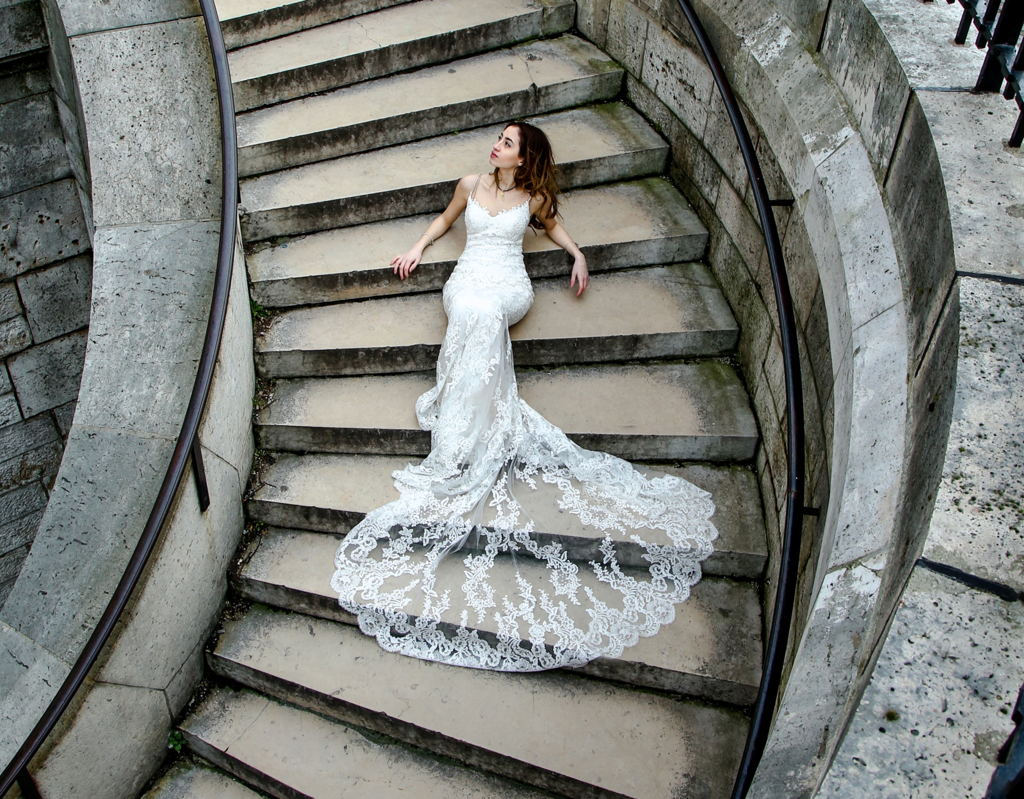 The beautifully scalloped, full length lace train of the Kymmy gown is captured weightlessly cascading the grand Parisian staircases, whilst the stone facades and textured walls perfectly juxtapose these angelic, lacy mermaid gowns and the fresh-faced, natural look of model, Agelica Simonyan.