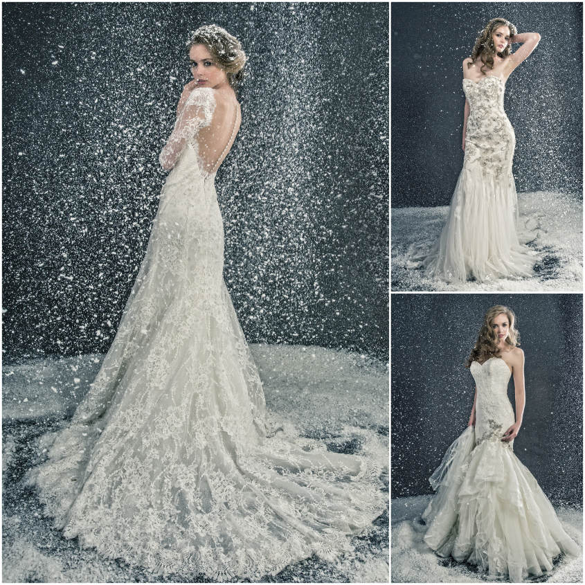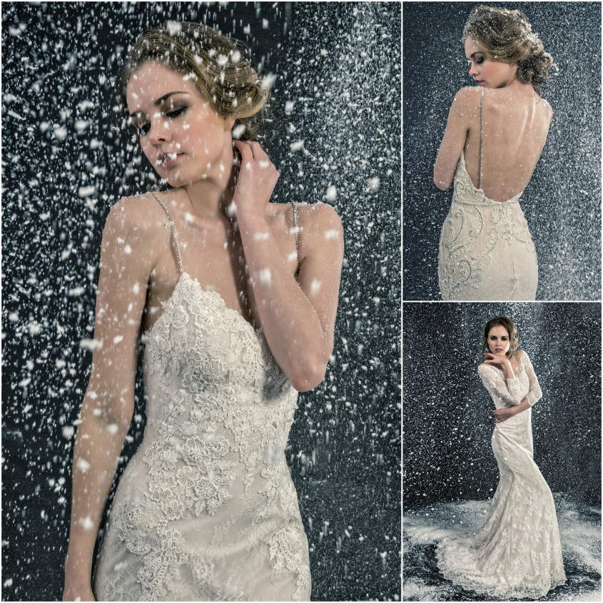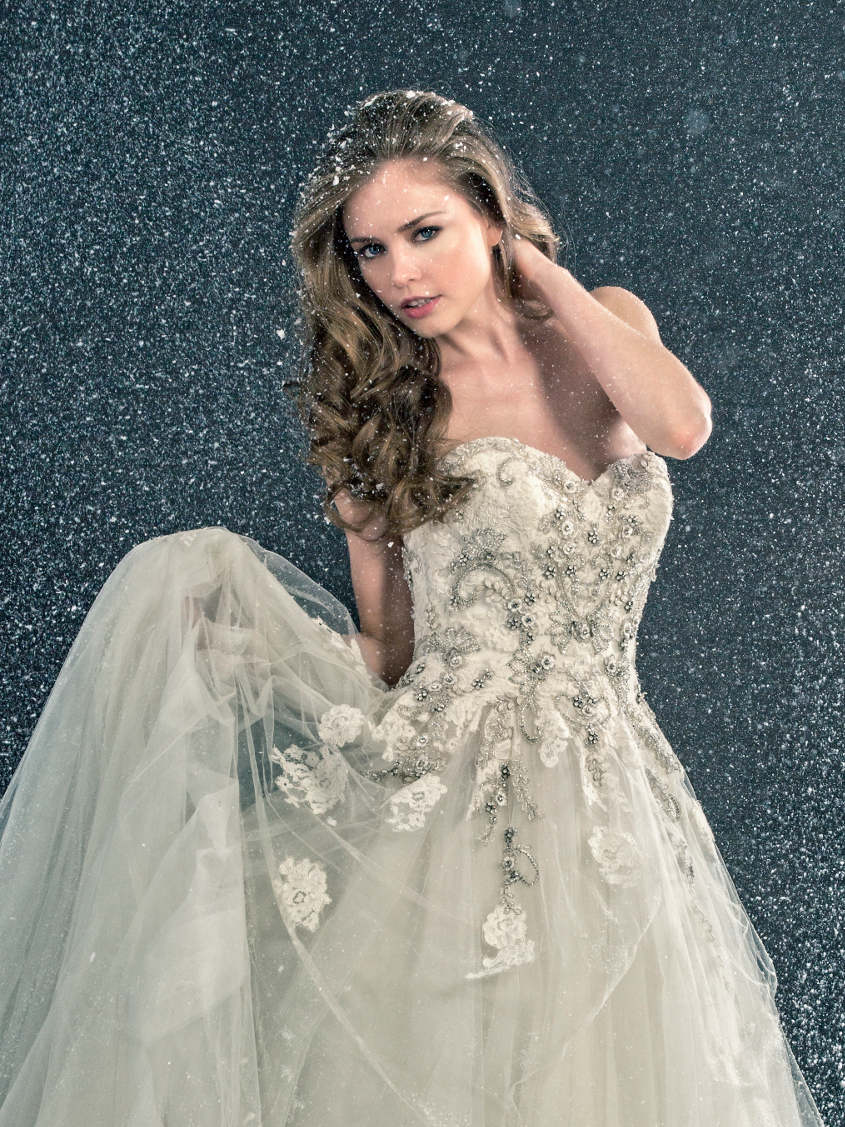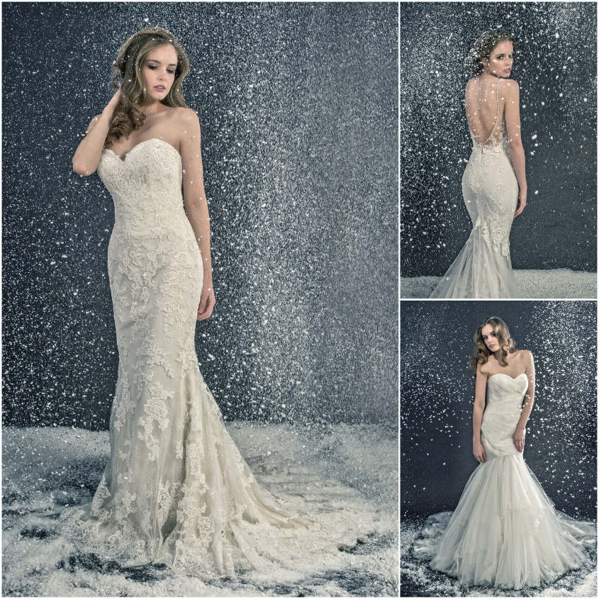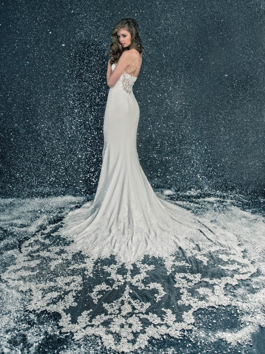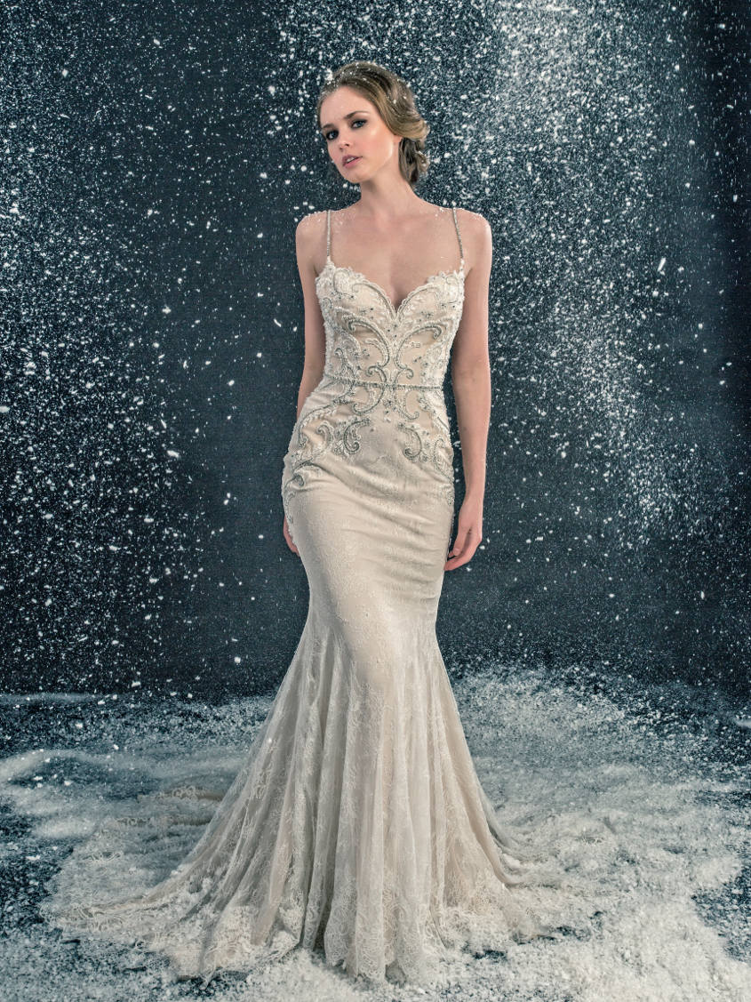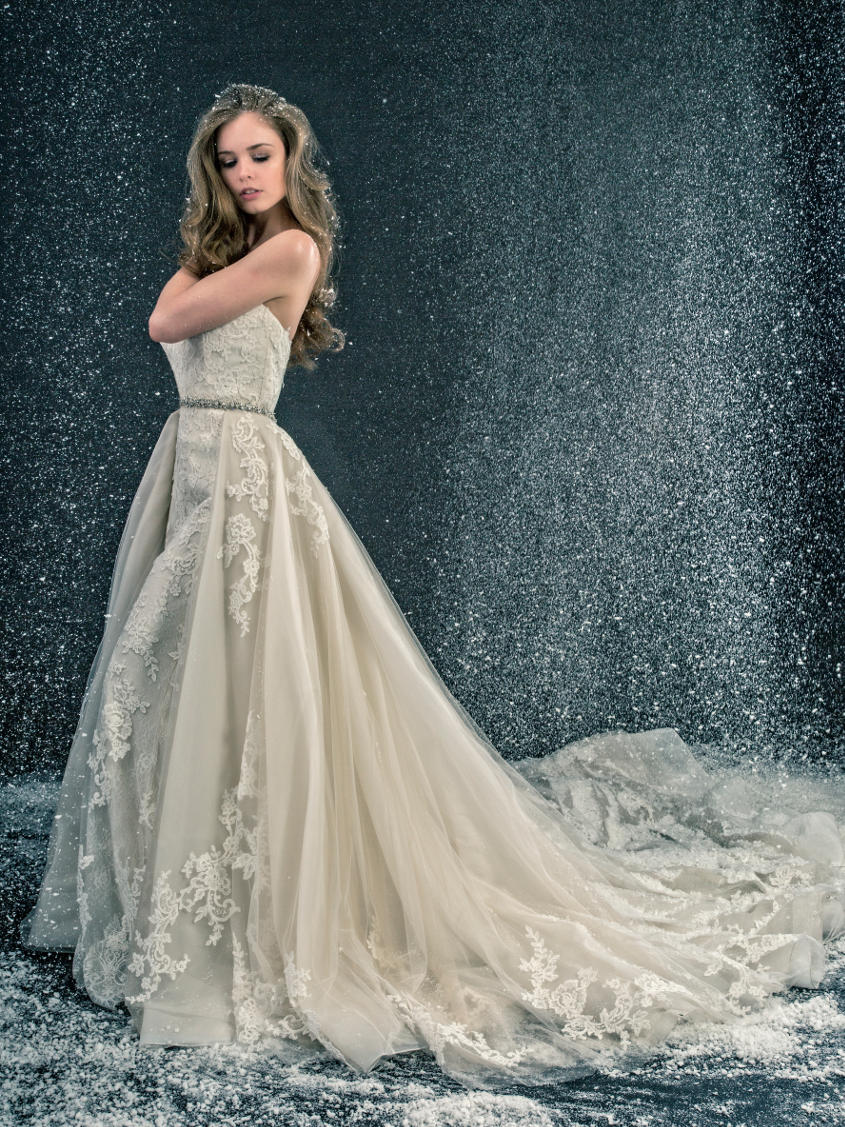 With lace patterning as unique as a one-of-a-kind snowflake, style Lexi (pictured above) from the 2017 Enzoani collection can also provide you with a picture-perfect winter wedding look. Delicate stones on the gown will provide just the right amount of sparkle in the snow white backdrop, while a flowing tulle skirt creates the dreamiest effect.