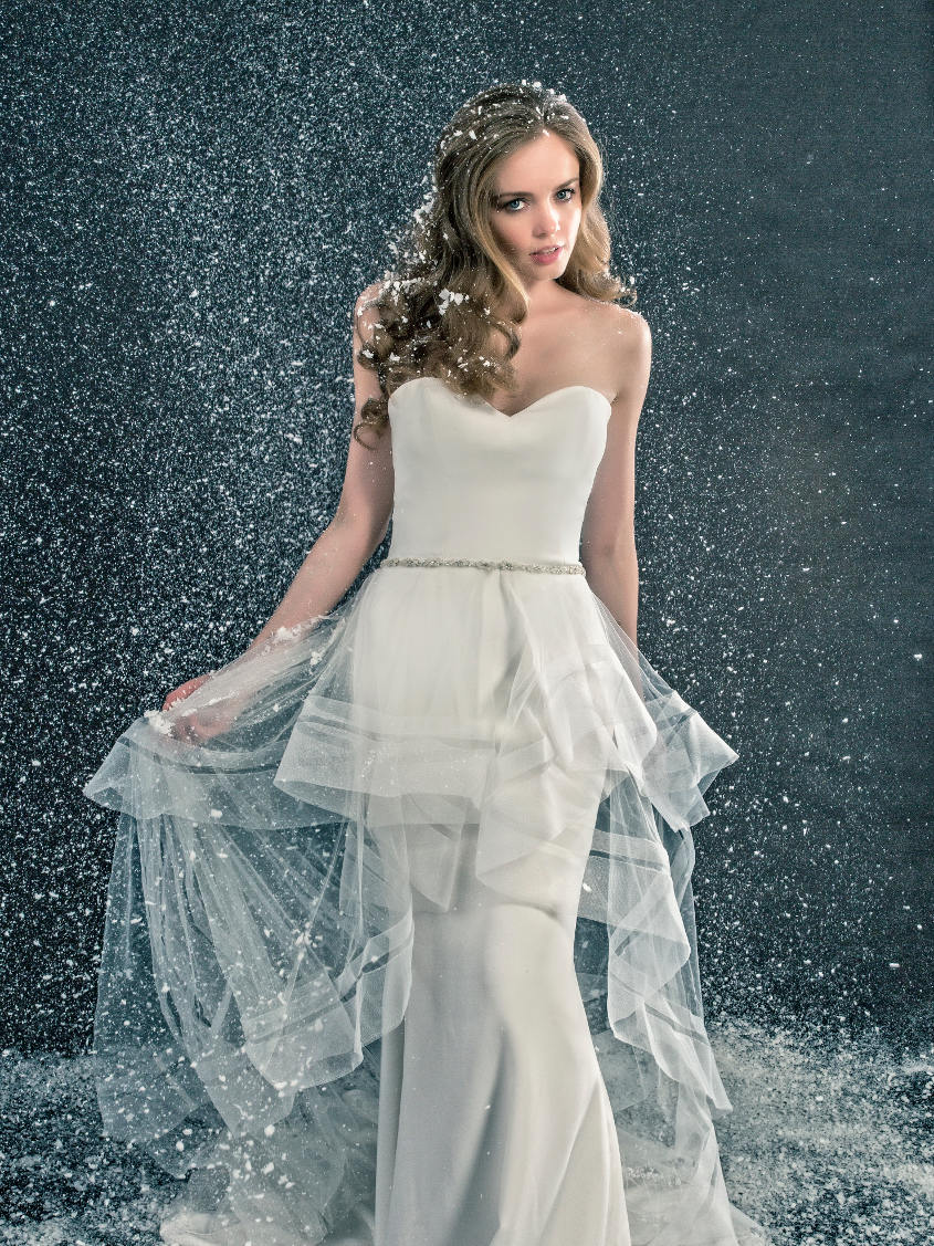 Looking for something ethereal, hip, and modern all at once to stand out in the snow? Style Janessa (pictured above) from the 2017 Blue by Enzoani collection checks everything off the list. This wedding dress is actually two looks in one, with a fun detachable high-low tulle skirt with horsehair hem -- perfect for layering over the sleek stretch georgette mermaid gown.