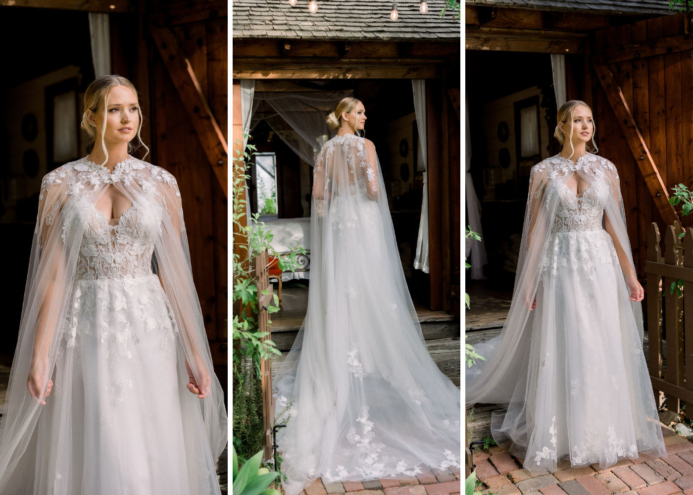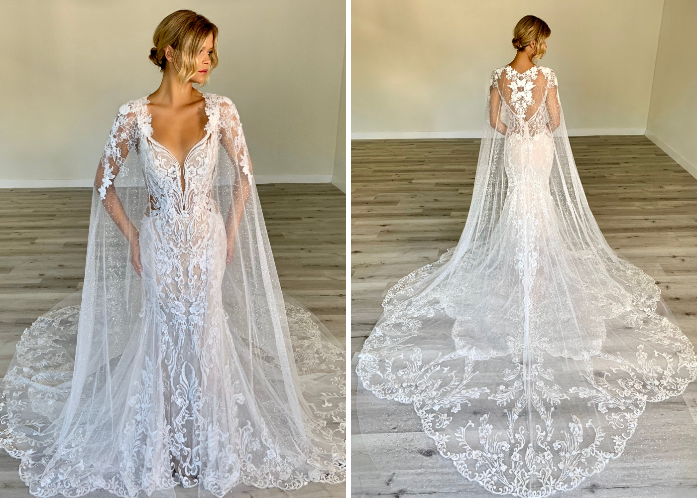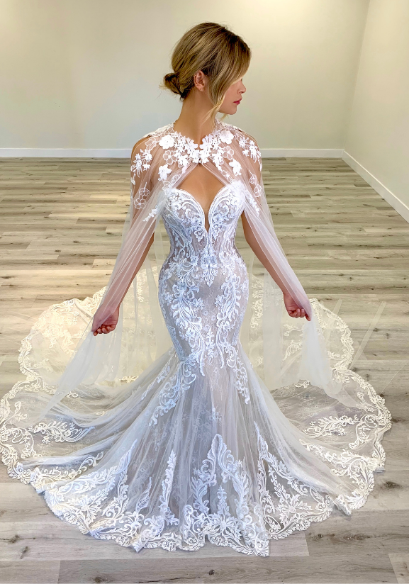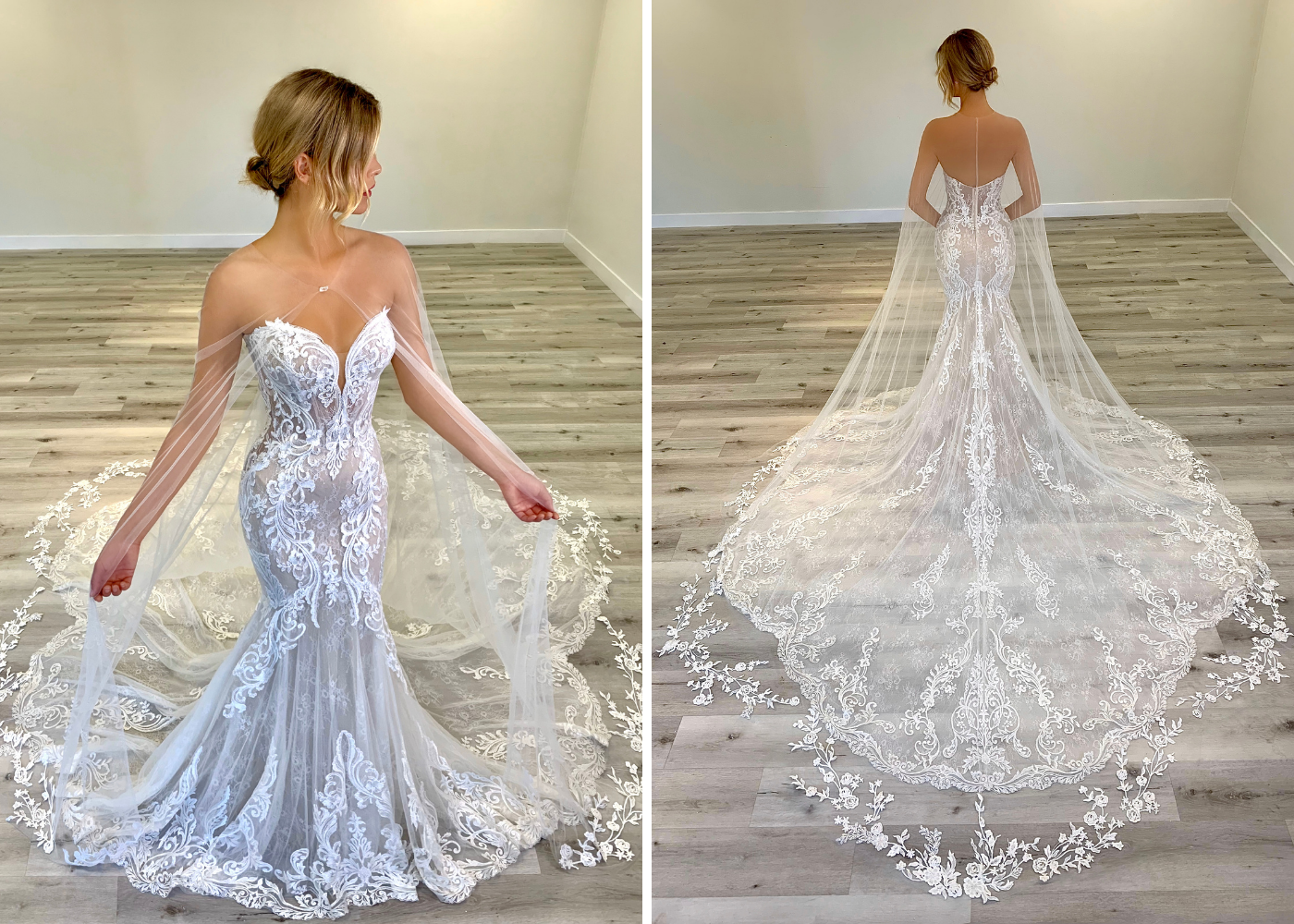 If a wedding veil isn't your cup of tea when it comes to your dream bridal style but you're still on the hunt for something romantic and dramatic, a cape could be a great alternative option. The VIVIENNE cape brings just the right amount of drama like a veil would, and looks chicly modern paired with any style of gown, such as an A-line wedding dress like PENELOPE (pictured above) or a mermaid wedding dress like ATHÉNAÏS (pictured left).