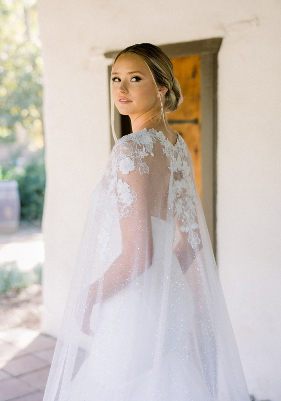 It's all about the lace and shimmer with our ROSELYN cape. The ROSELYN cape is an all-over sparkling cape with a romantic floral lace design on the shoulders. Similar to a removable jacket, this cape comfortably sits right on the shoulders without falling. The cape goes well with a super swirly lace gown like FRANÇOISE or a sleek Mikado gown like GIGI.