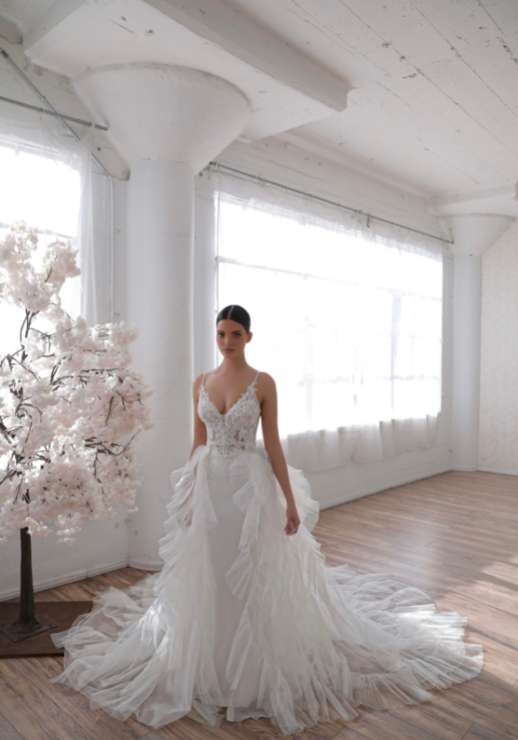 The detachable DELPHINE skirt is a beautiful ruffled overskirt that you can wear atop your dream dress for added elegance -- guaranteed to be a show-stopper!