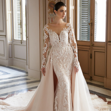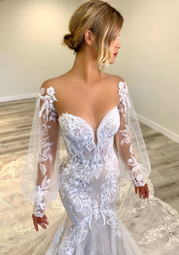 The detachable, long CLAUDINE sleeves are perfect for brides who love dreamy, swirling lace. Adding sleeves is a great option for colder weather weddings -- and provides an easy way for you to enchant your wedding guests with two different bridal looks on the big day!