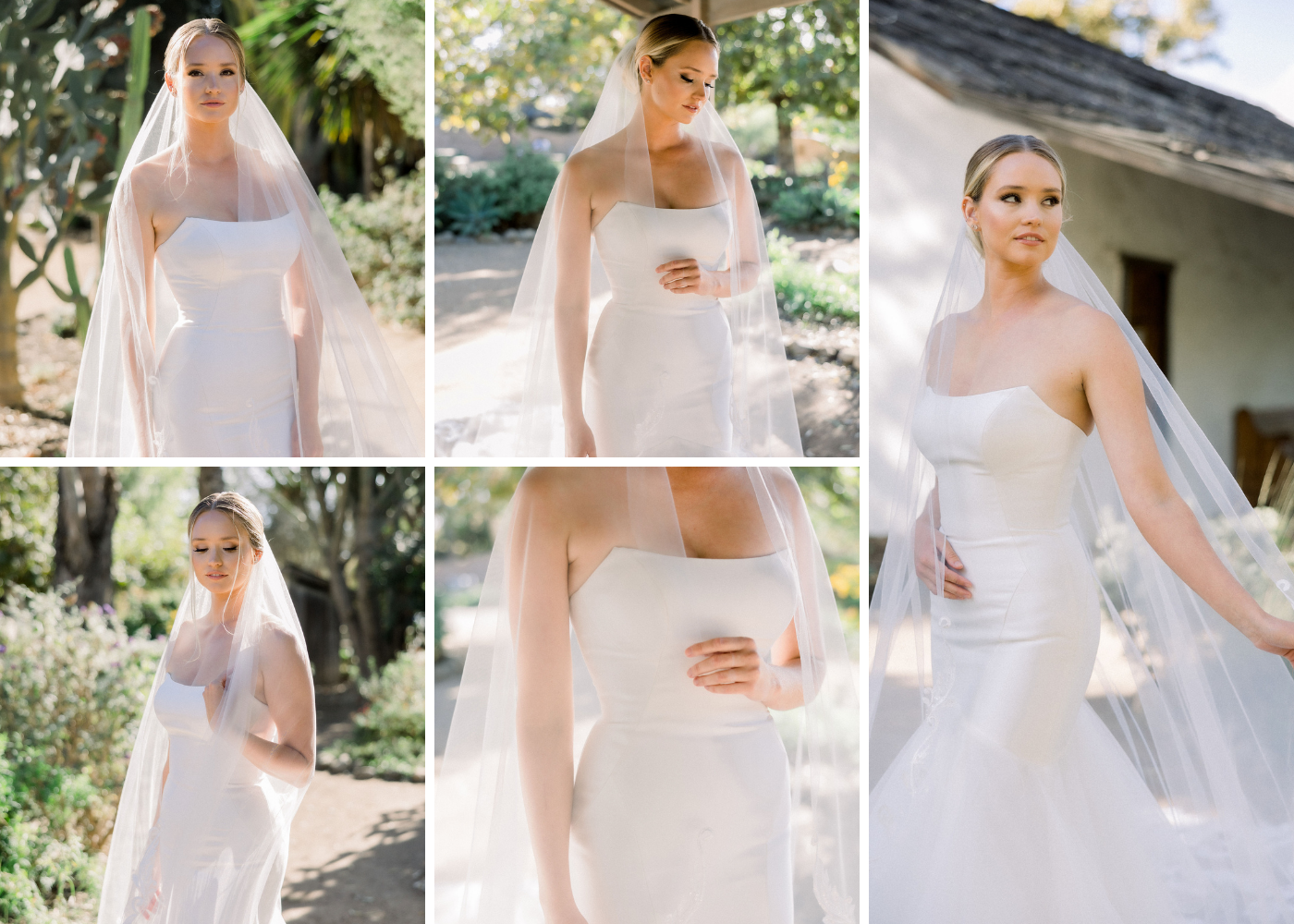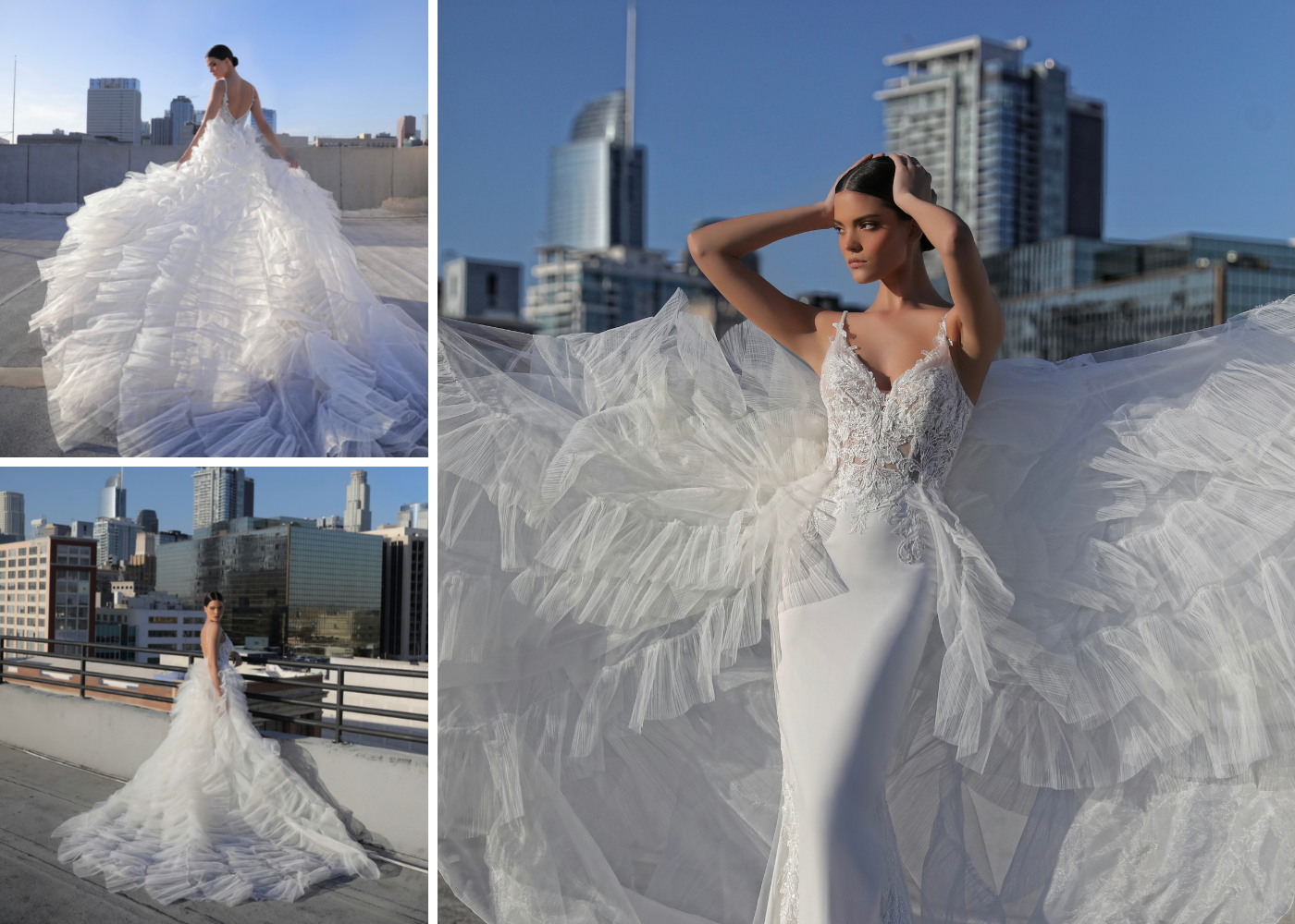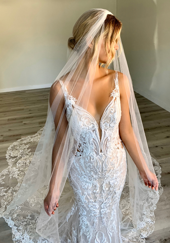 How about our EVANGELINE wedding dress shown here with our SABINE veil? Check out that breathtaking triple-sculpted hem train!