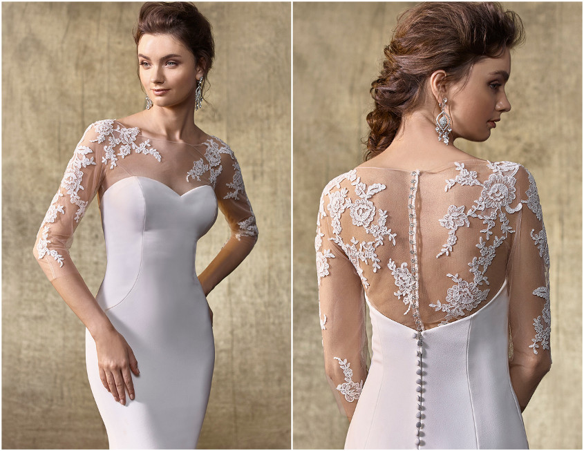 If you've already found your perfect gown, but are looking for a special way to add more coverage without the appearance of an outer jacket, try a unique inner dress piece like Lenore-ID (pictured below with the Logan gown).