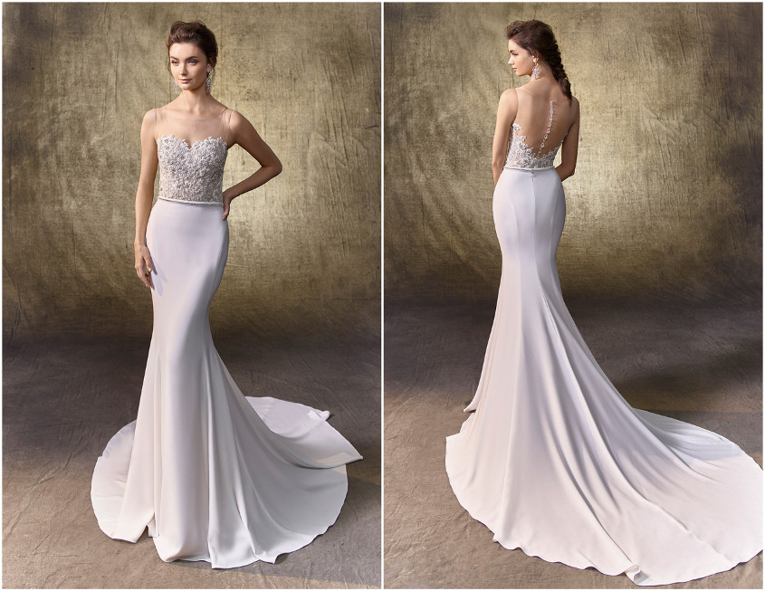 The great thing about bodysuits? They can work with ultra-dreamy A-line skirts and sleek, curve-hugging mermaid styles, like Lily (pictured below). A delicate beaded belt adds a subtle touch of shimmer and helps to make the Liv bodysuit stand out with its beaded, embroidered lace and Chantilly lace and striking bateau illusion sweetheart neckline.