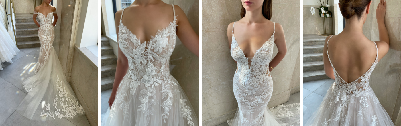 Steal hearts with this relaxed yet fashion-forward sheath gown. This delicate dress features embroidered lace motifs paired with Chantilly lace for an effortless bridal look. We are in love with the s