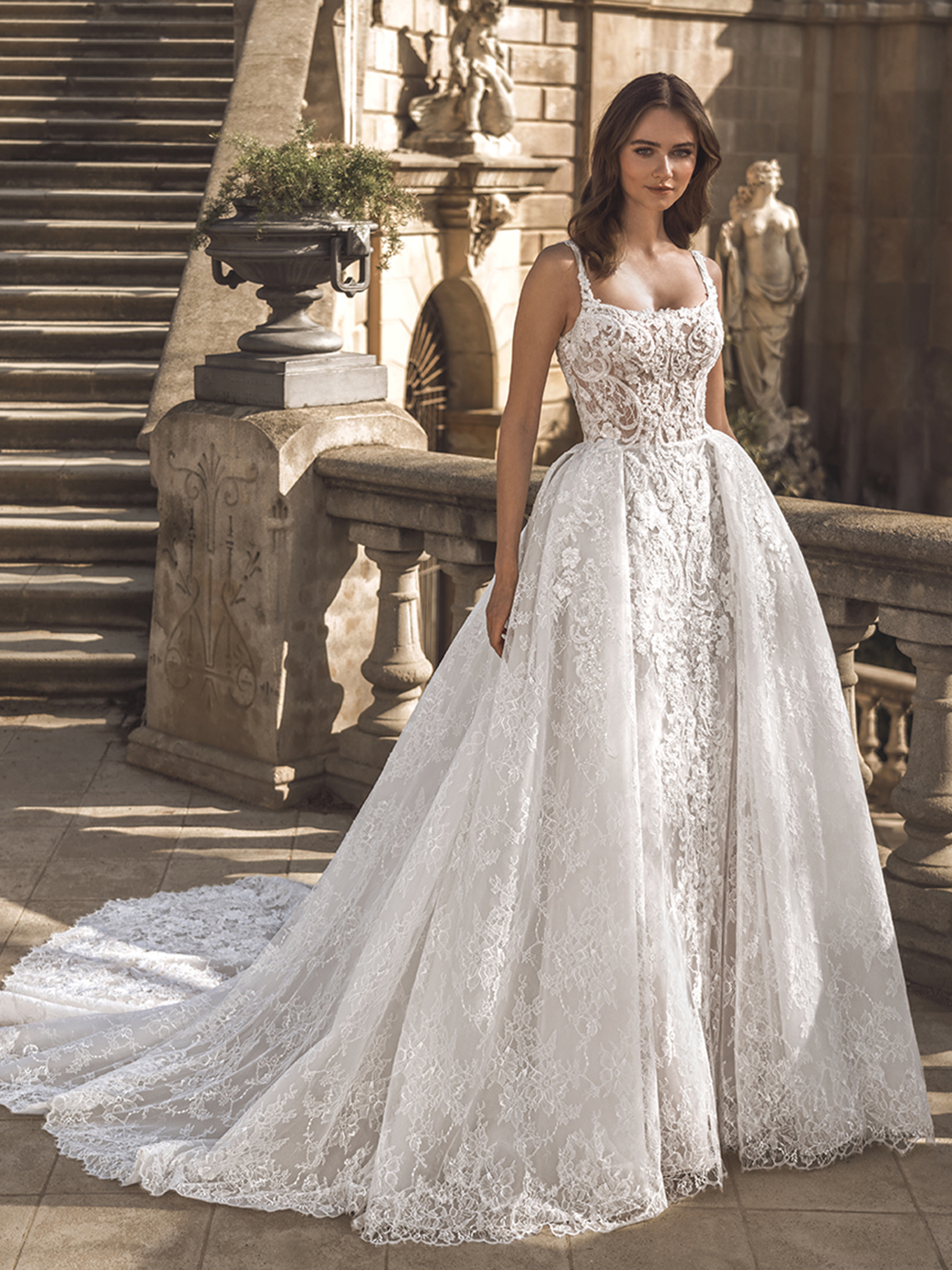 Introducing the grand FORINA wedding gown from the Privé collection! Crafted in luxurious beaded sequinned floral lace, this ethereal ballgown silhouette exudes timeless elegance. The square ne