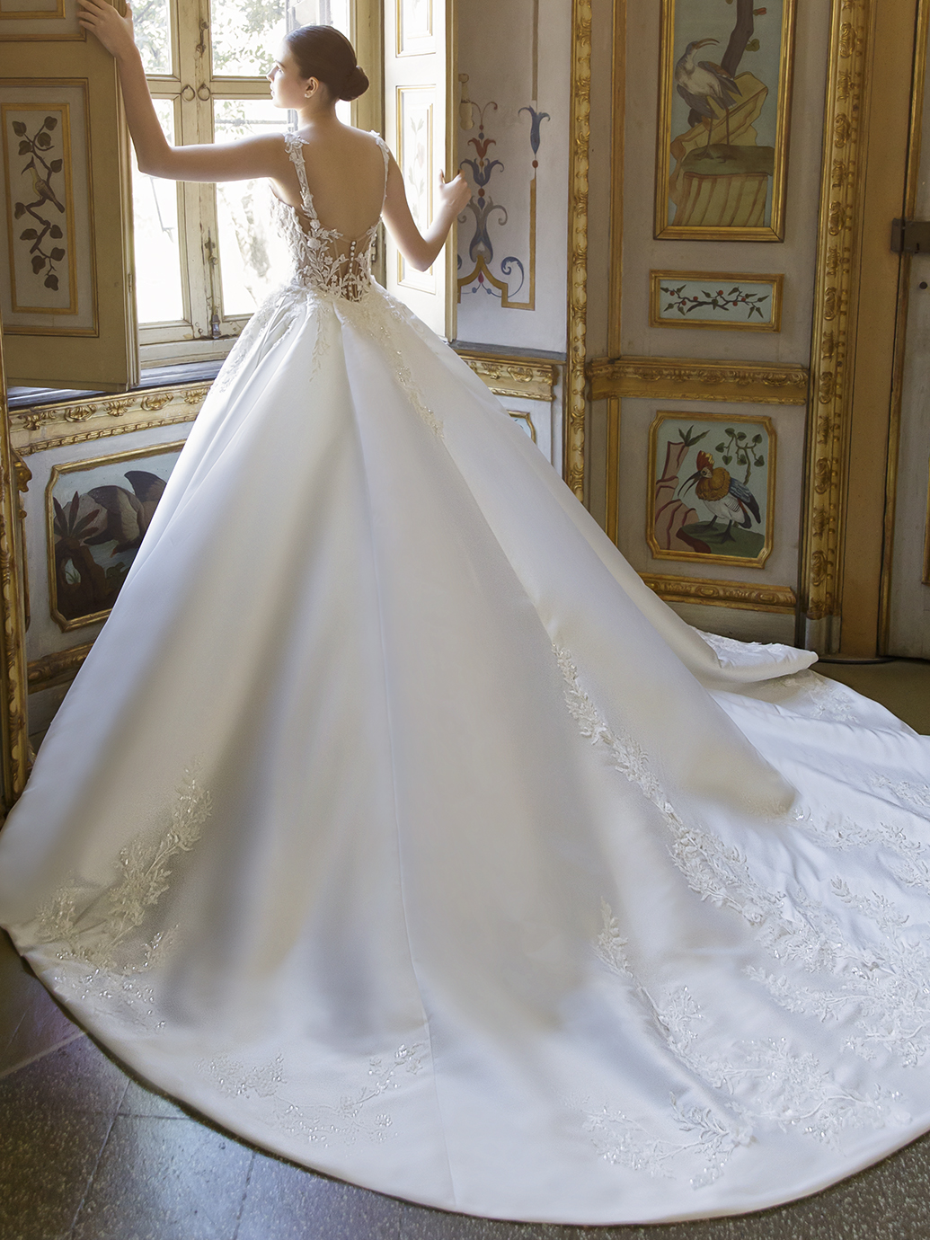| DIVINA está aquí para brillar con luz propia con sus multicapas de encaje floral con pedrería y cuerpo de encaje Chantilly con delicados motivos florales en relieve. Este vestido nos deja atónitos con la glamorosa y desmontable sobrefalda de vuelo con bolsillos, mejorada con encaje de pedrería brillante adicional. Al retirar la sobrefalda descubrimos una falda tubo sexy y drapeada con una impresionante abertura alta y una cola esculpida ÉLYSÉE. ¡Un espectacular look dos en uno para el día de tu boda! |