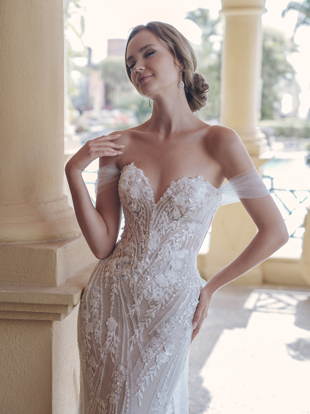 Embellecido con pétalos florales bordados con lentejuelas, encaje floral bordado y encaje perlado geométrico que bailan a lo largo del corpiño hasta la preciosa cola, este vestido de novia sirena irradia una sofisticación y encanto maravillosos, perfecto para la novia que busca una mezcla de elementos clásicos y modernos. Los dulces y desmontables tirantes de tul fuera del hombro añaden versatilidad, mientras que la espalda de corpiño con trasparencia y los detalles de lazo de tul suave seguramente dejará a tus invitados boquiabiertos mientras avanzas por el pasillo.