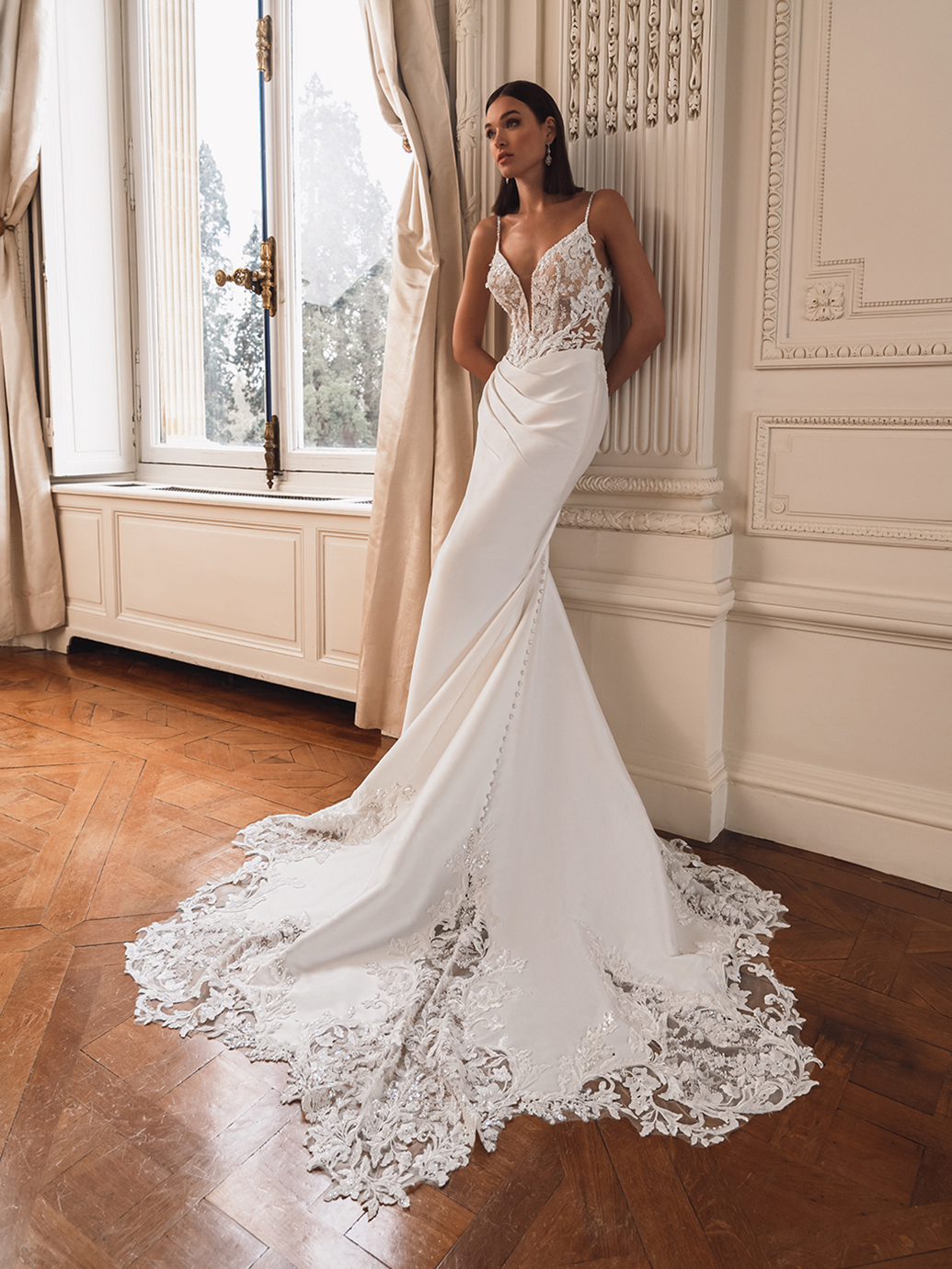 FIA is the epitome of modern sophistication. The eye-catching deep V-neckline bodice with 3D floral lace and sparkling beaded floral lace is the perfect amount of shimmer for this gorgeous look. The sleek, thoughtfully draped Mikado mermaid skirt with a sexy high slit is effortlessly elegant and figure-flattering as it extends into a stunning statement train with sweet button detailing.