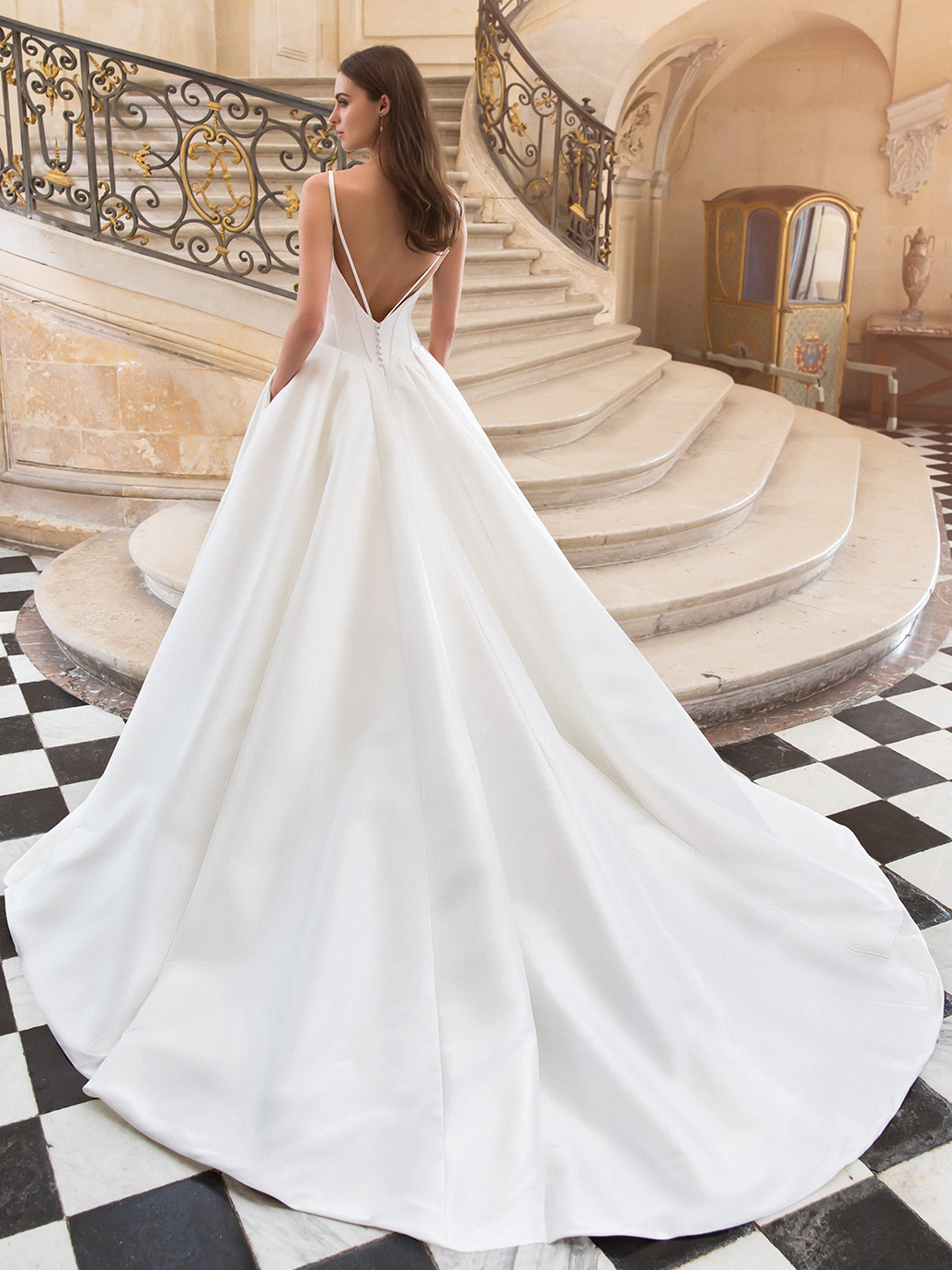 Make a grand entrance with this Mikado dream! This glamorous ball gown has a daring illusion V-neckline as well as illusion V-side cut-outs to match the breathtaking low back accentuated with elegant straps. MIRREN provides a sculpted bodice to cinch the waist and flatter the figure while providing the perfect amount of support. And… she also comes with pockets!