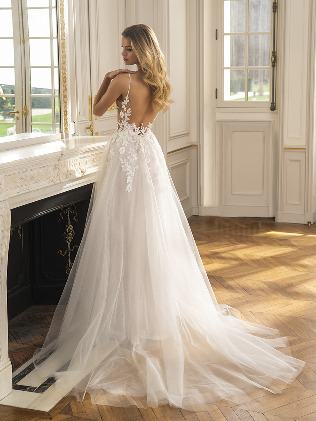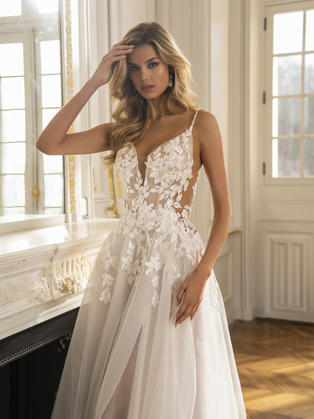 Soft and romantic, EVANKA is a classic A-line gown with a modern twist – figure-flattering, sexy side cut-outs adorn the sweet V-neckline bodice with 3D floral appliques and beaded floral lace. With a dreamy, sparkling A-line skirt and high-slit peeking out beneath a soft tulle overlay, this bridal style is guaranteed to impress.