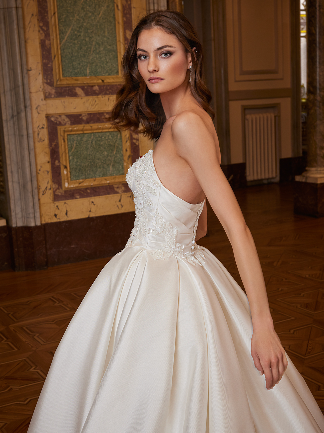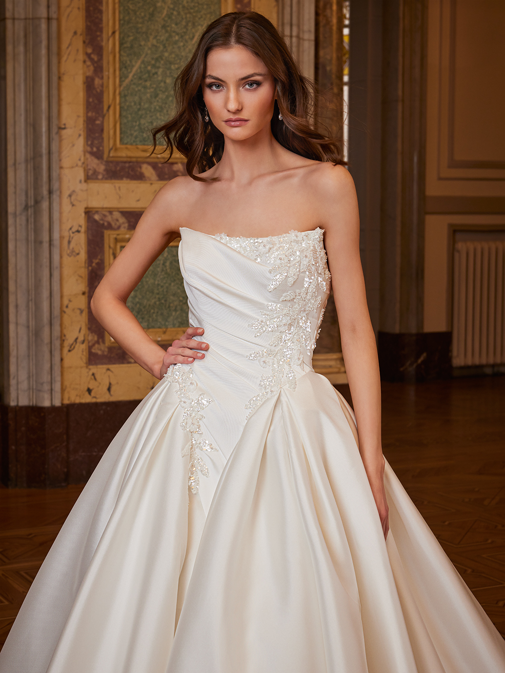 Effortlessly merging minimalism with glamorous allure, EILEEN boasts a draped bodice adorned with dazzling 3D floral appliques cascading into the basque waistline and voluminous skirt that exudes opulent charm. This gown has a glamorous flair with its glistening beaded floral lace train, sure to leave your wedding guests stunned as you walk down the aisle.