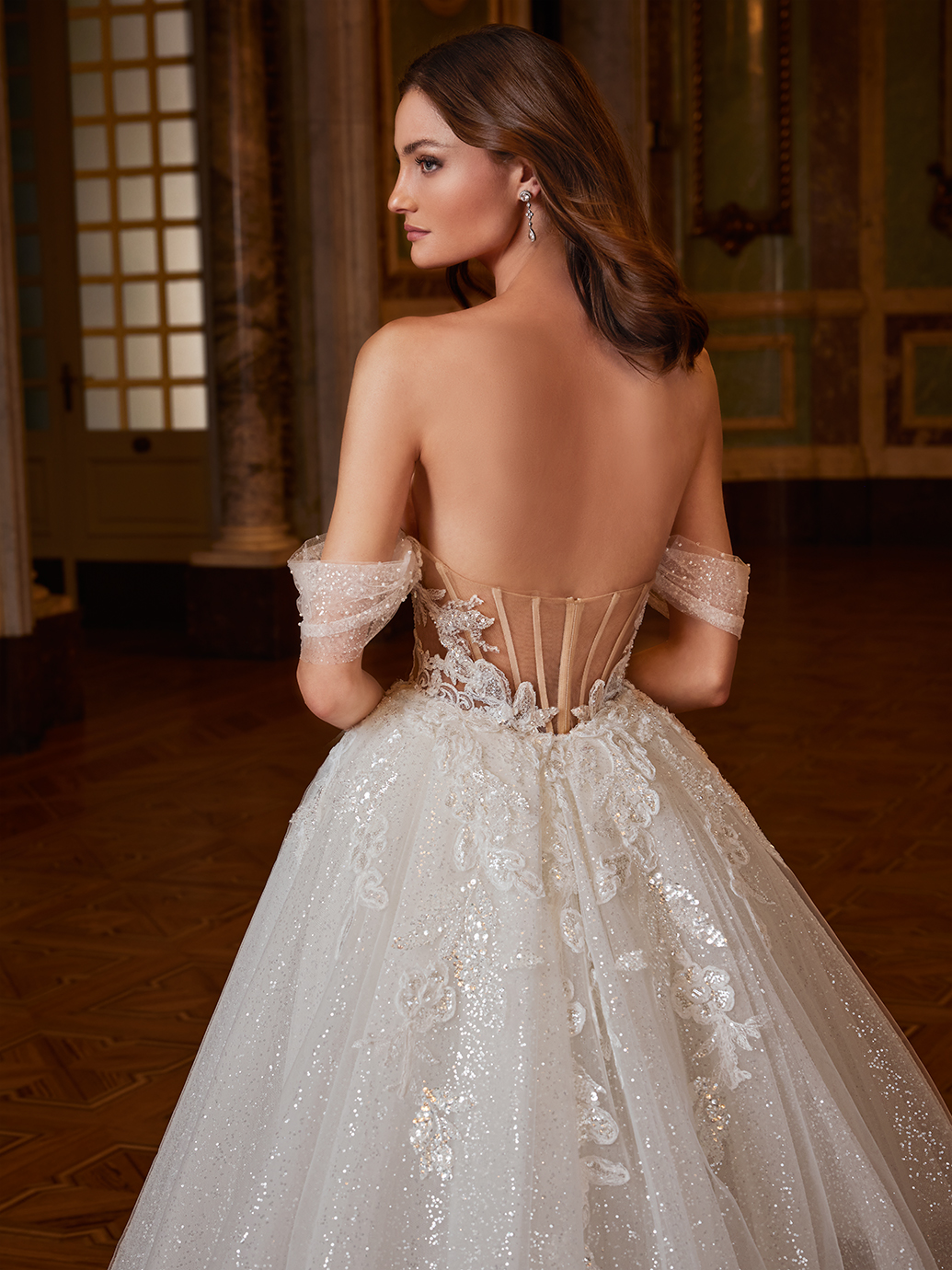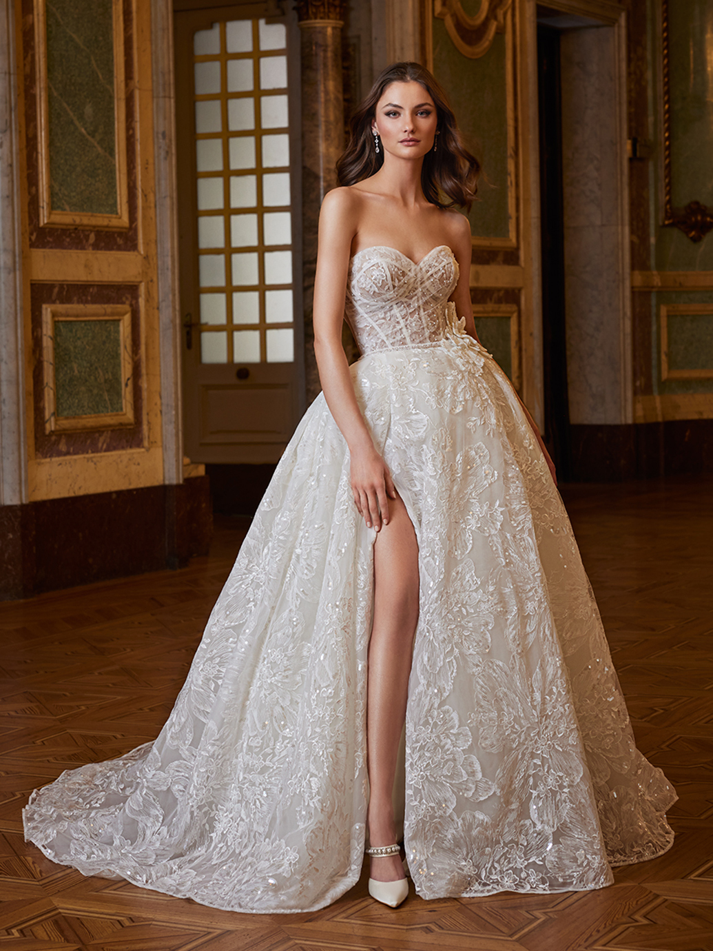 Boasting a romantic sparkling lace bodice with detachable off-shoulder straps, EMILIA exudes princess-worthy charm and feminine allure. The enchanting, detachable ball gown overskirt can be removed to reveal a stunning, figure-flattering mermaid silhouette hiding beneath. Beaded lace and floral embroidered lace detailing adds a touch of glamour, while the illusion back ensures a flattering fit, allowing the bride to feel like royalty as she walks down the aisle.