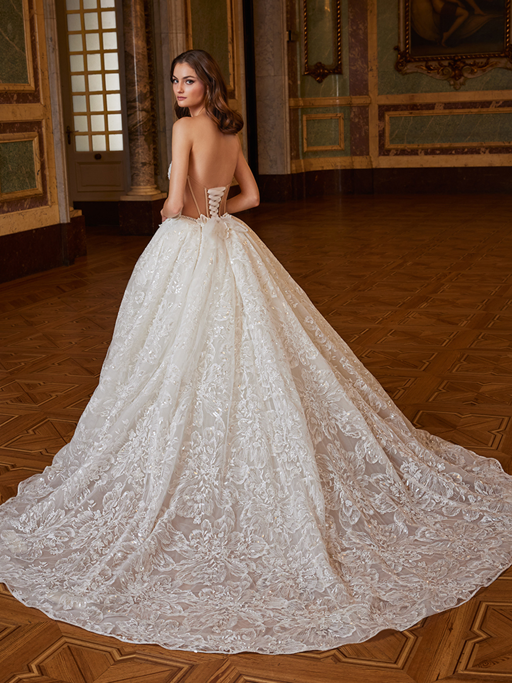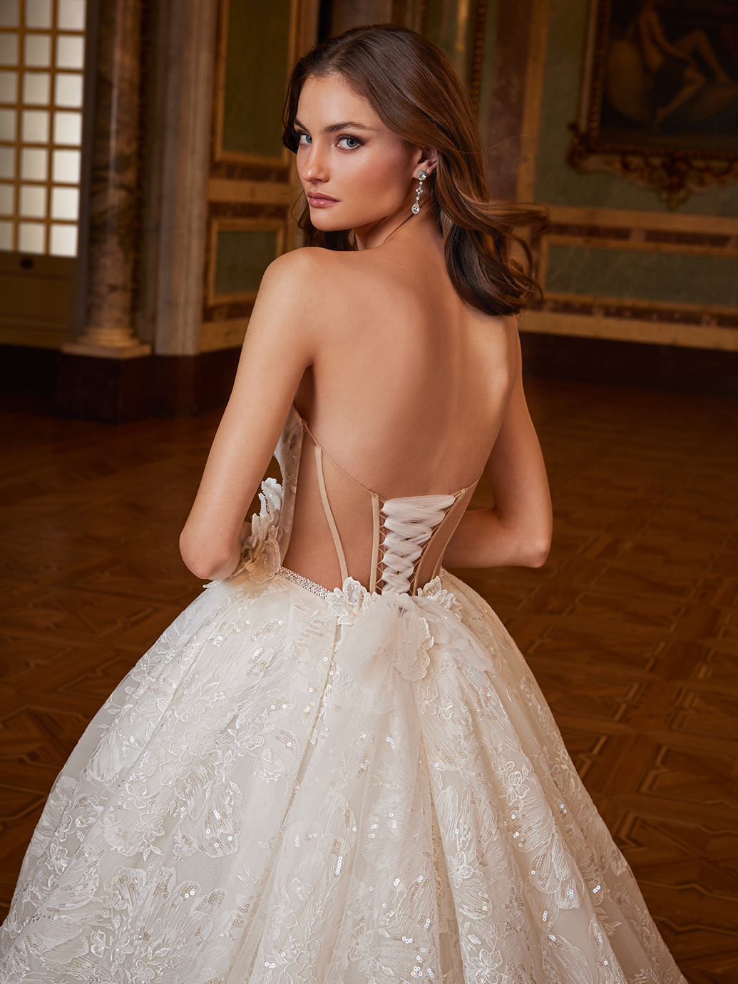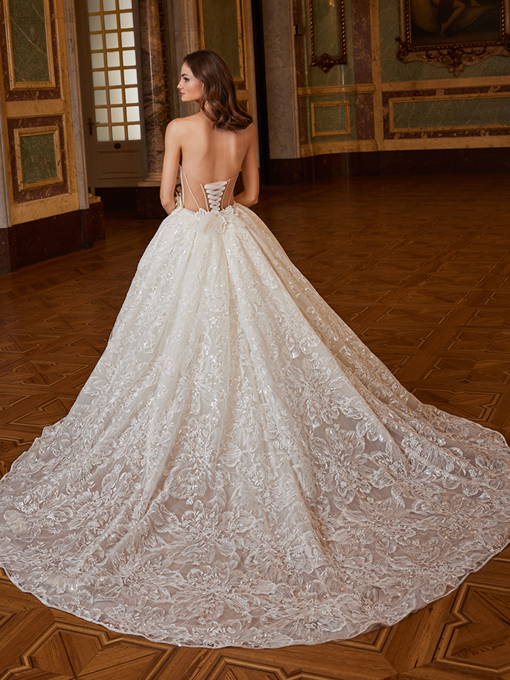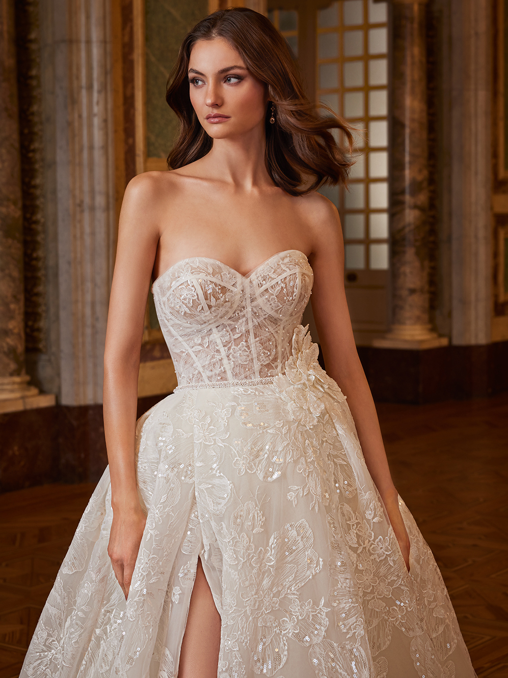 Dazzle in every movement! ESMERALDA presents elaborate, one-of-a-kind floral fabric adorned with shimmering sequins and 3D flowers, creating a look that is both romantic and captivating. The glistening, voluminous ball gown skirt with a sexy high slit adds a touch of drama, while the stunning corset back accentuates and contours the curves beautifully, ensuring you’ll look and feel like a princess on your special day.