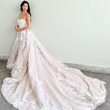 Twirling in TRIANON! She is a gorgeous Mikado A-line with a stunning sculpted neckline and detachable, 3D floral off-shoulder sleeves that give such a flattering look to any bride.