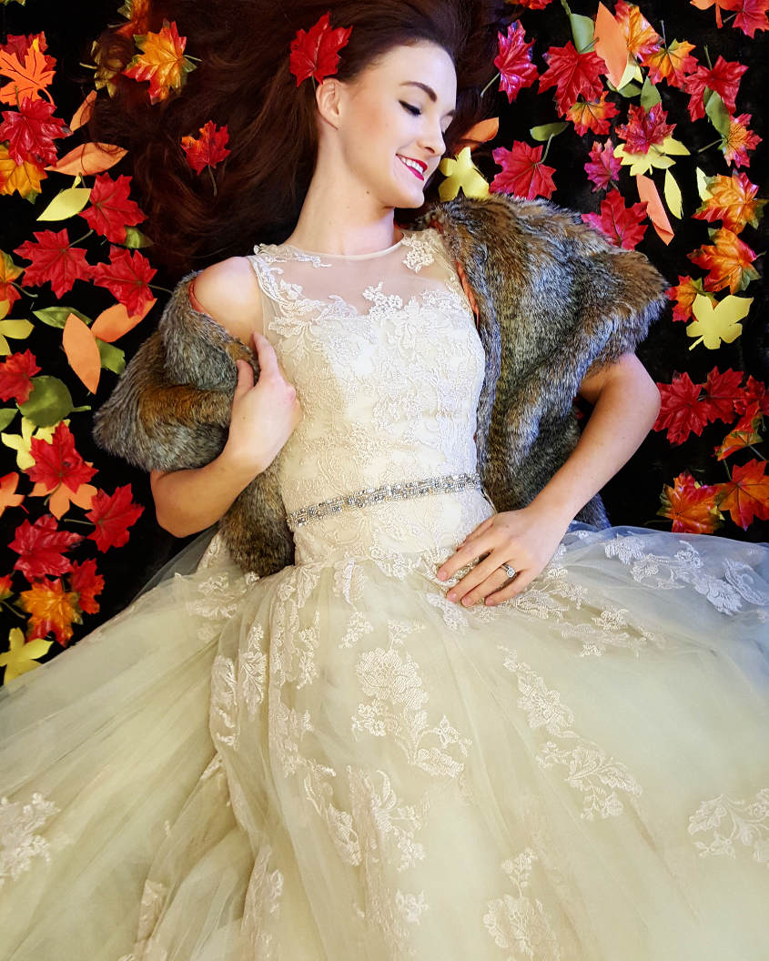 This fall, dive into the magic of the approaching holiday season with a little autumn inspiration. From leaves changing colors to warm, rich shades of red, yellow, and orange, to bundling up with faux fur wraps in the crisp pre-winter air, fall is certainly a special time of year. Take a peek below to see how our Olivia-M wedding dress is the perfect gown for this gorgeous season.